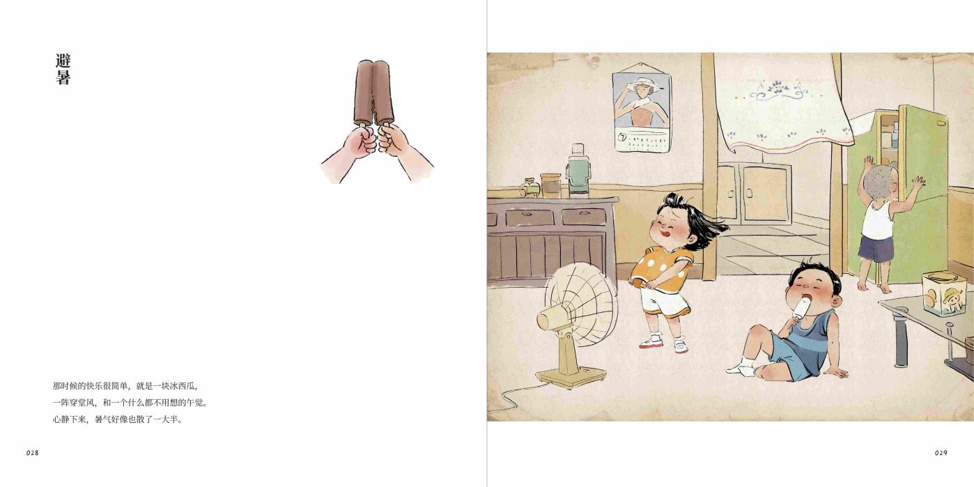 本书《纸鸢飞过,我们仍是孩子》是一部以童年记忆为主题的图文创作集,全书围绕童年生活的美好片段展开,分为“岁时记”“旧物志”“好伙伴”“念亲恩”四卷。“岁时记”以四季为序,细腻记录不同时节中的童年乐趣:春天“一脚踩进溪水抓蝌蚪,把心里那点皱巴巴游得平平展展”;夏日有“老蒲扇摇出的懒洋洋的风”;秋天是“摘柿子时那一跳一跳获取的甜”,冬日的味道则藏在“烤红薯金黄的瓤里,一寸一寸暖透身体”。这些文字与画面共同编织出童年与自然相亲的质朴欢愉。