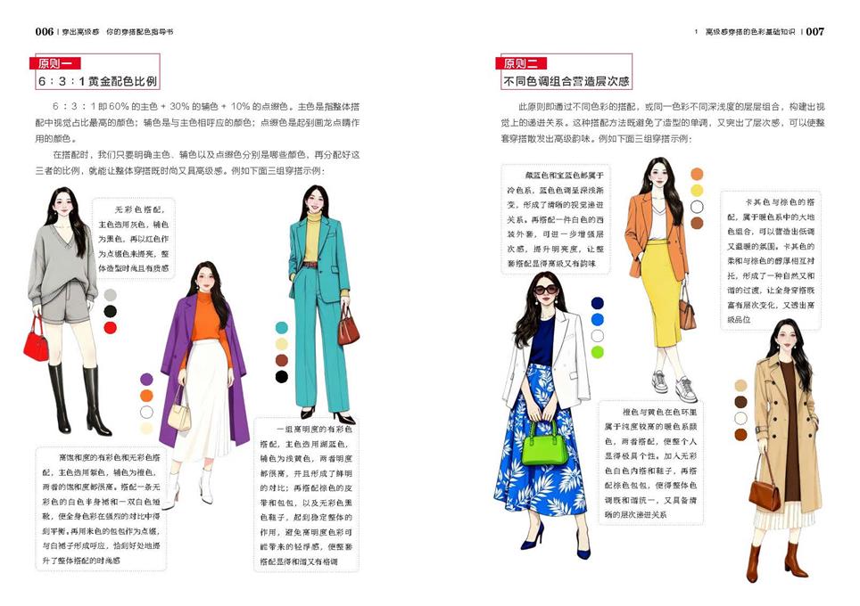 书中配套500多张精美色彩穿搭插图,堪称“抄答案式”指南,照着搭配就能穿出时髦品位。即便随意翻阅,书中的配色公式也能快速印入脑海,助力读者瞬间提升审美水平。无论你是20岁到60岁的任何年龄段,若受够现有形象、想在形象上保持竞争力,或是希望通过形象增添底气,这本书都值得深入研读。