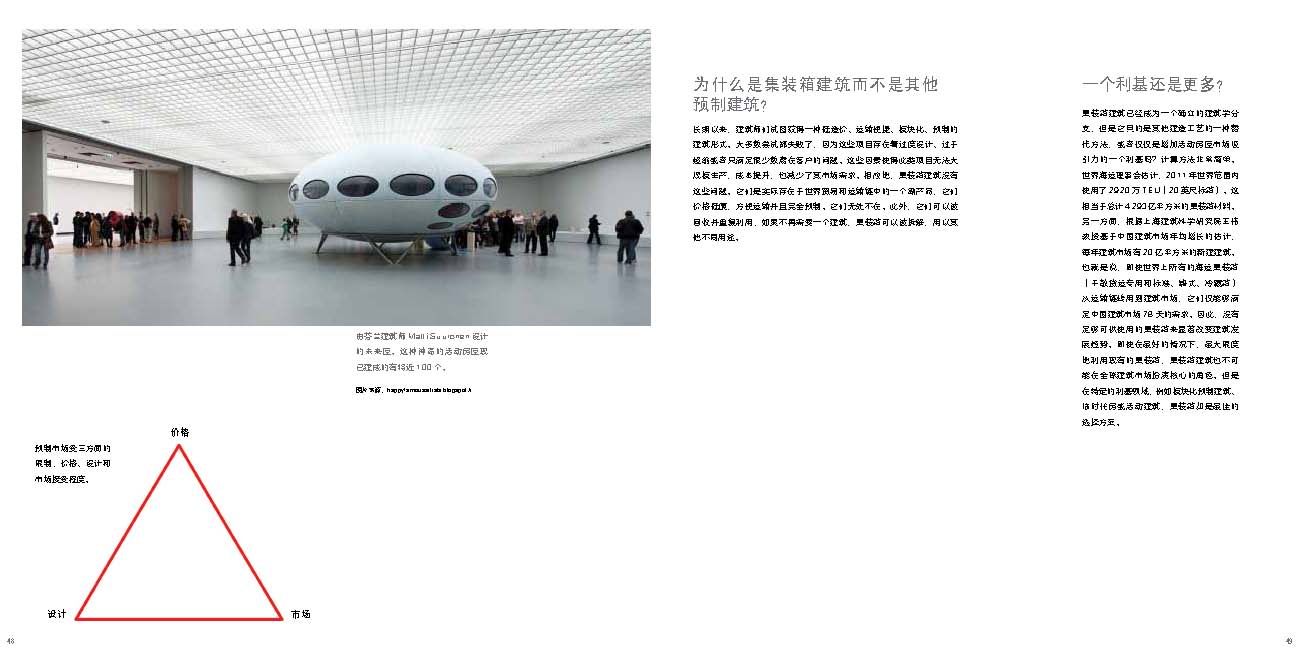 • 集装箱建筑适合城市发展需求,其安装简便,可以模块化生产,绿色环保,省时省力,非常灵活多变,相对传统住房能提供给住家更多的选择,一个钢铁盒子做成的房子充满时尚气息。该种建筑形式符合现代化城市新型住宅的走势,是在倡导适合现代社会需要的绿色消费。它将为创新城市建设的发展需求,绿色生活房屋的推广,以及在现代建筑环保节能方面,具有很强的示范作用和经济拉动作用。
