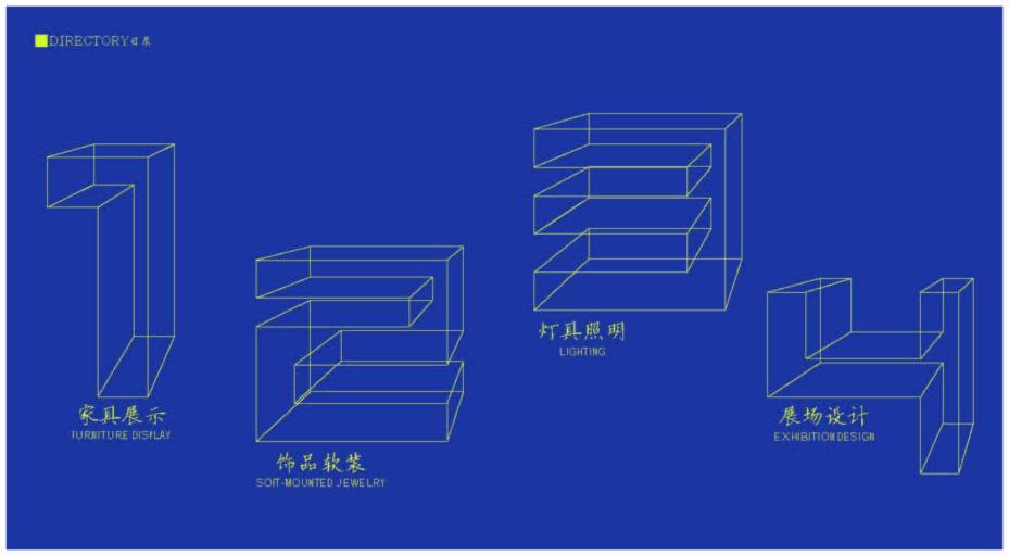 1.分为家具展示、饰品软装、灯具照明、展场设计四个部分。
