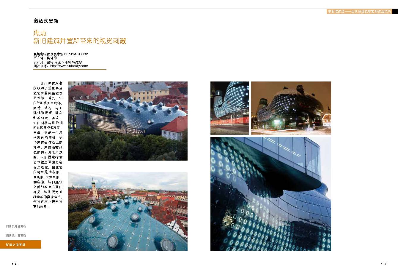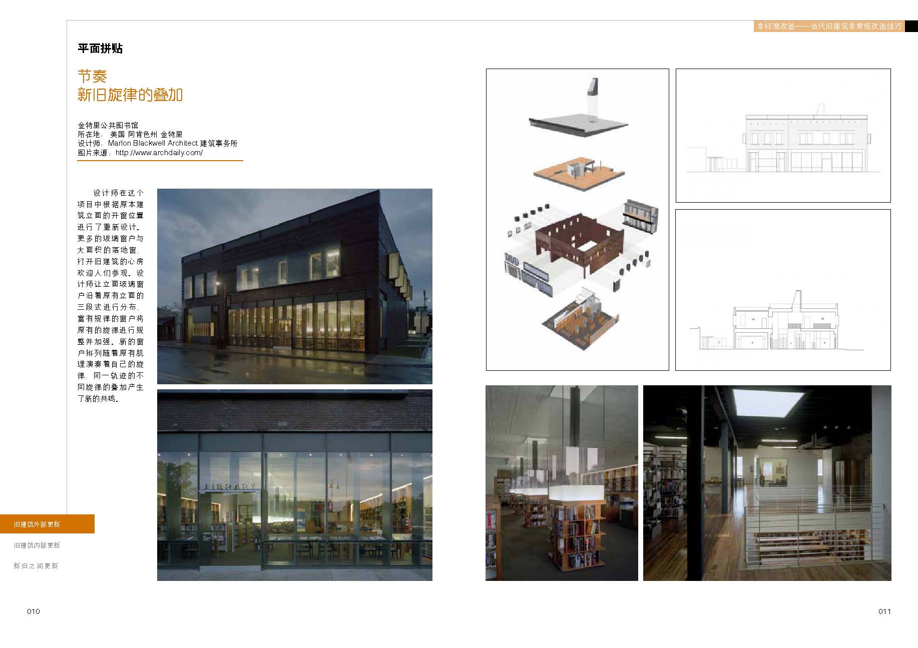 本书以大量富有创意的旧建筑改造更新案例为基础,通过对近些年的旧建筑改造更新案例进行分析。从创意性案例中寻找它们之间的规律,并从这些规律中归纳出具体手法。从三个方面对旧建筑改造更新进行归纳:旧建筑的外部更新手法,旧建筑的内部更新手法,新旧建筑之间的更新手法。并分别对每部分的具体手法进行设计技巧提炼,对同类手法之间微妙差别进行具体研究,对学生学习和设计相关建筑具有启发意义。