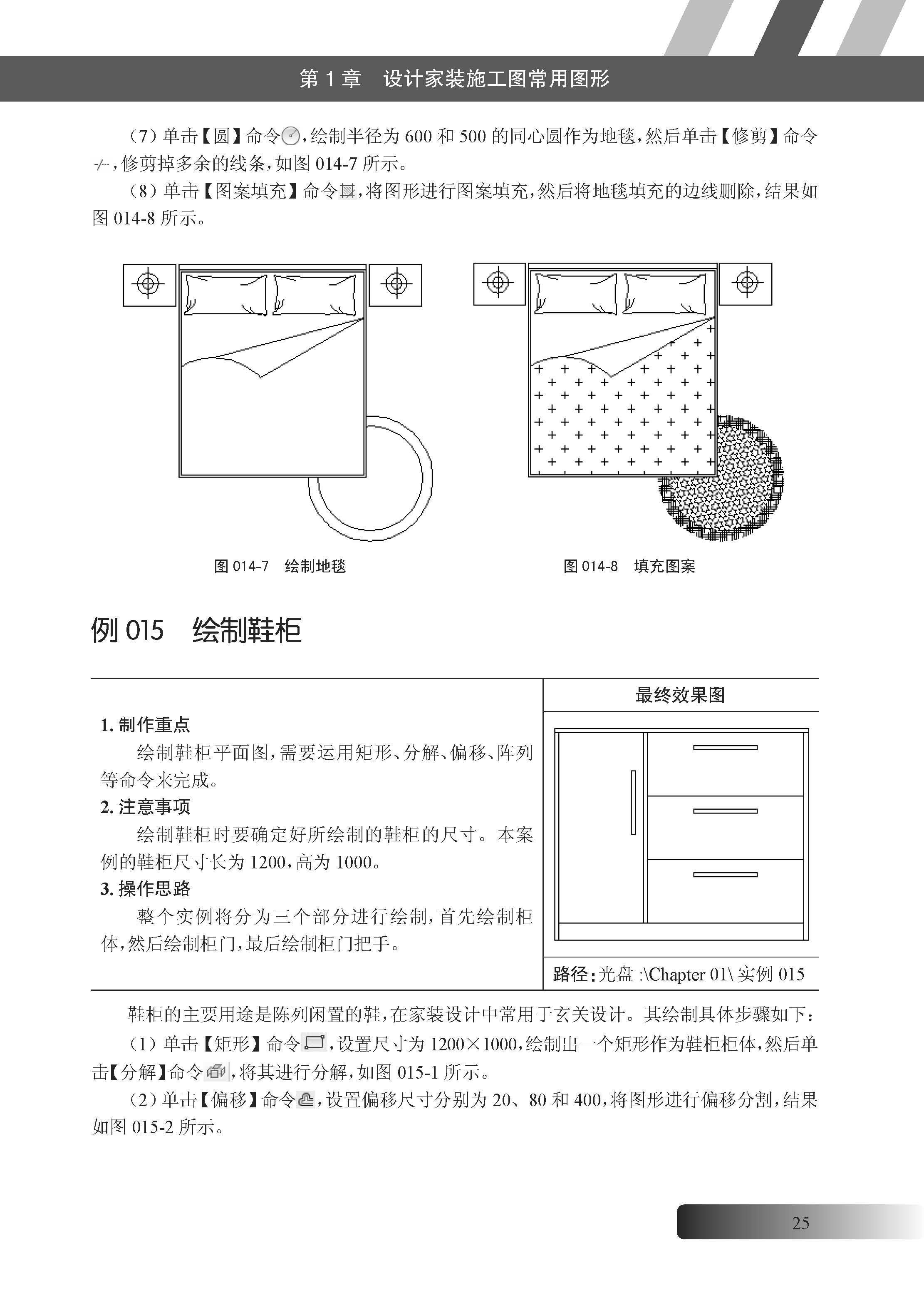 本书以建筑和室内设计制图为主,精心挑选了近200个案例进行讲解。全书共15章,主要内容有:设计家装施工图常用图形、绘制工装施工图常用图形、设计施工图常用材料图形、设计园林施工图常用图形、设计现代风格小户型图、设计简欧风格两居室图、设计现代风格三居室图、设计错层户型图、设计中式别墅图、办公空间设计方案、酒店客房设计、KTV包厢设计、餐厅设计、服装专卖店设计、绘制家具三维模型等。