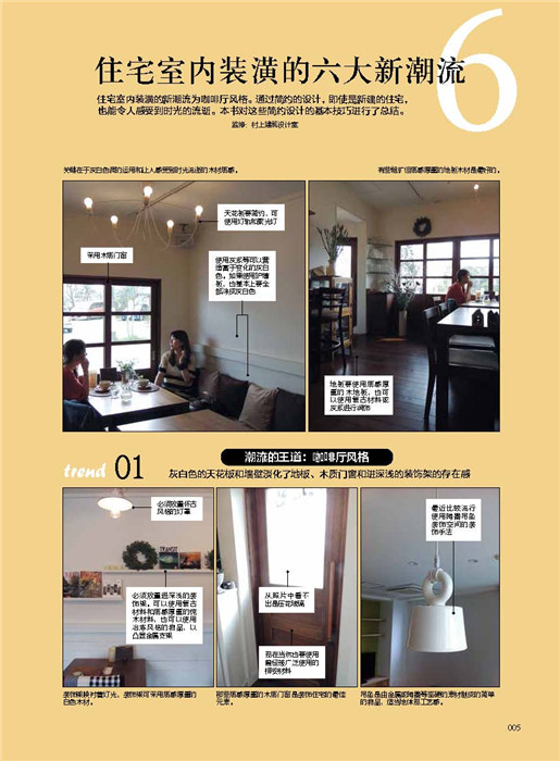 书中不仅提到了木材、水泥、板材、砂石、瓷砖、玻璃、壁纸等主要材料,还涉及了五金配件、楼梯扶手、装饰灯具等这些细部材料,详细地介绍家庭装修中所涉及的各种材料的应用。同时还从业主的角度出发,对家具的选择与搭配进行了介绍,例如:通过组合收纳柜、“岛屿式沙发”、可移动式凳子变换空间格局,结构与家具一体化,活用宜家制品的墙壁收纳等。