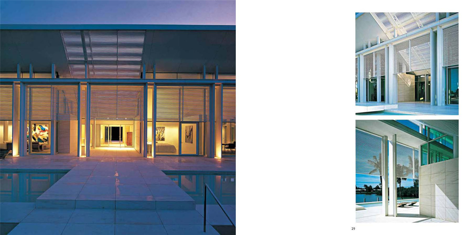 理查德·迈耶丛书共计6卷,收录了理查德·迈耶以及迈耶工作室近50年来的全部设计作品。迈耶设计的产品都颇为简练,既包括居家设计也包括商用设计。他设计的作品最大的特点是永远有自己的特性而不是在风格上受别人的影响而迷惑。由于其大胆的风格和值得称颂的忠诚,迈耶创造出颇为独特的粗壮风格。为了在展示方面做得更好,他将斜格、正面以及明暗差别强烈的外形等方面和谐地融合在一起。迈耶的作品以“顺应自然”的理论为基础,表面材料常用白色,以绿色的自然景物衬托,使人觉得清新脱俗,他还善于利用白色表达建筑本身与周围环境的和谐关系。在建筑内部,他运用垂直空间和天然光线在建筑上的反射达到富于光影的效果,他以新的观点解释旧的建筑,并重新组合几何空间。