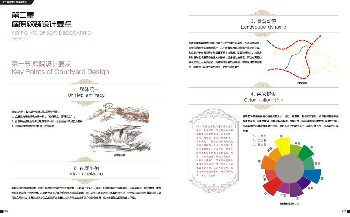 度入手着重介绍庭院软装的搭配和设计元素。从庭院家具、植物配置、庭院小品、铺装灯饰和不同庭院功能分区的软装设计要点等多方面,做了详细的介绍和说明。