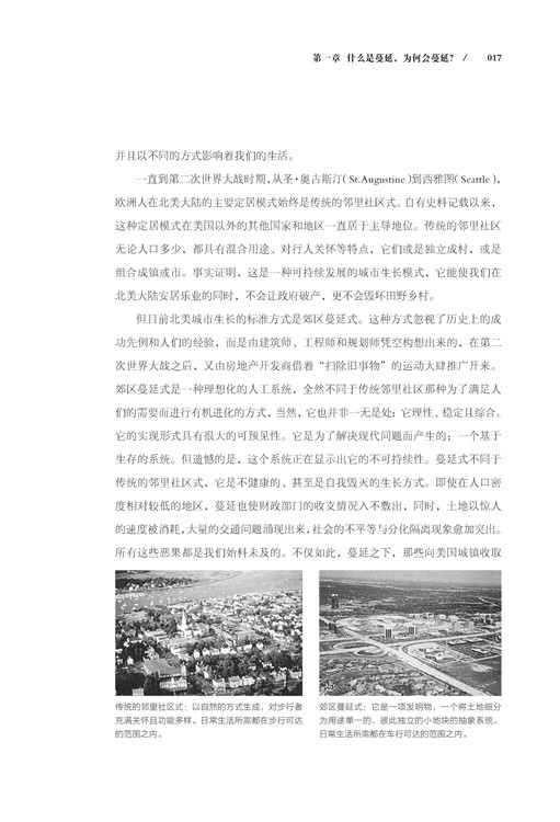 当今,无论我们住在城市还是郊区,该居住地的形式和特性都不是我们可以选择的,而是根据联邦政府的政策、地方土地区划法规以及交通工具的需要而强加给我们的。如果这种影响的关系可以颠倒过来——这是完全可能的——那么,一种服务于个人的真正需求、有益于社区形成和景观保护的环境就会应运而生。有一点我们无需惊奇:这种环境将非常类似于美国老的邻里社区被“蔓延”破坏之前的样子。