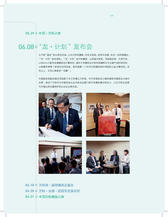 本书记录了完整呈现米兰万科馆从想法到实现的全流程,从前期策划、设计、建造、运营和后世博遗产计划几大阶段,向读者展示184天台前精彩亮相背后的布局筹措。万科馆带给观众带来一种文化觉醒的意味。冥冥之中,隐藏于众多不同面向的参与者的意念里,有一条一以贯之的关于传统与未来的暗线:建筑师里伯斯金从一种超现实的设计手法出发却无意间回归到千年而来的中国农耕文化图腾——龙;展陈设计方RAA将传统竹料与脚手架并置,隐喻了未来与传统的冲突与统一;平面设计的简体汉字,构建了一种易于沟通的东方语言;“龙•计划”里盘旋了千年而重新苏醒的传统村庙文化。