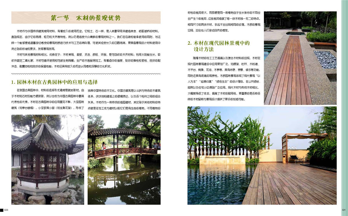 目前,木材应用于景观设计正处在一个新旧材料、新旧技术交替时期,不久的将来,在充分保护环境和遵守有关国家规定的前提下,从生态、资源可持续发展的角度积极、合理地开发利用木材资源,相信专用室外才材及其景观制品将得到更广泛的应用及大家的认可。本书的亮点在于: