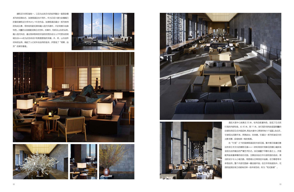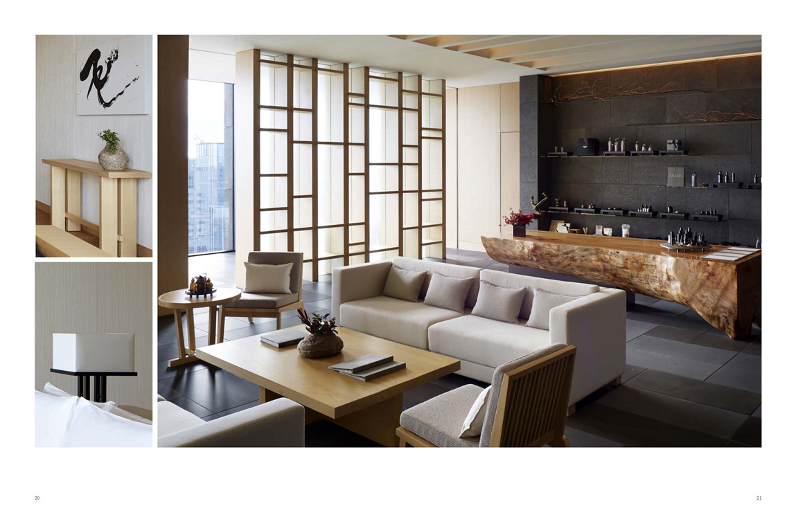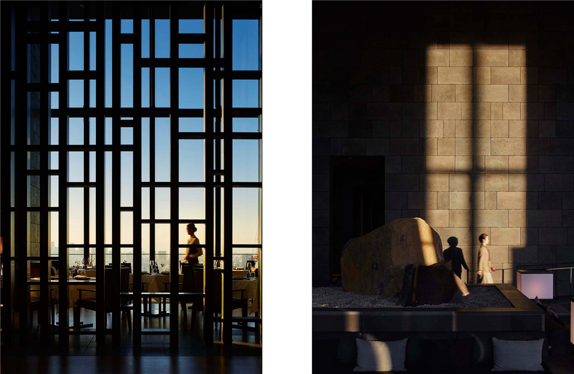 东京安缦酒店是以建筑室内设计与当地建筑文化的和谐统一为设计思路,通过一系列独特的构成元素,将传统和韵完美地融入现代风潮中,巧妙地展示自身特色。大量的光线搭配经典日式材料,如樟木、和纸及山石的运用,融入现代科技,通过各种各样的织品和材质形成令人不可思议的明暗互动——成为此空间设计和氛围营造的关键。木、纸、山石自然材料的运用,唤起了人们对朴实自然的追求,并营造了“简素、自然”的禅宗意境。
