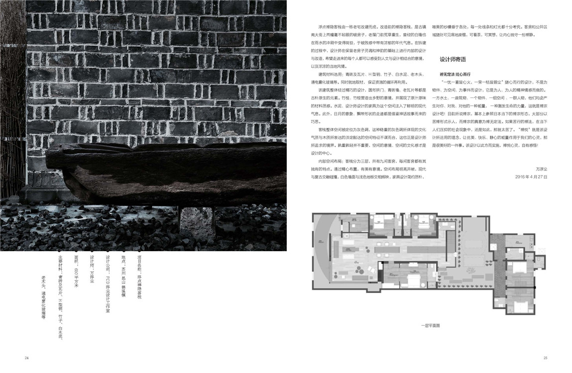 “一忧一喜皆心火,一荣一枯皆眼尘”随心而行的设计,不是为物件、为空间、为事件而设计,它是为人、为人的精神情感而做的。一方水土、一座筑物、一个物件、一组空间 、一群人物,他们均会产生对你、对我、对他的一种能量, 一种激发生命的力量,这就是禅宗设计吧!目前所说禅宗,基本上参照日本当下的禅宗形态,大部分以苦禅形式示人,而禅宗的真意为禅无定法。如果苦行的禅法,在当下人们压抑的社会现象中,还是如此,那就太苦了。“禅悦”就是该设计所运用的理念,让优美、快乐、静心的能量作用于我们的心灵,那是很美好的一件事。浮点禅隐客栈的设计却是以此方而实施的……18个酒店案例风格各异,却都是从不同方面表达禅意。