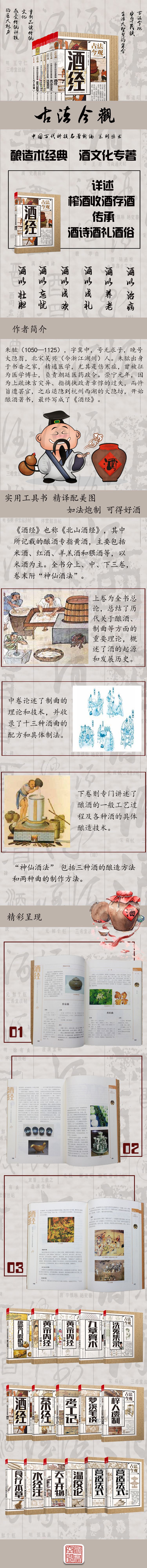 宋代朱肱所著的《酒经》是宋代酒文化的经典之作,书中既有对中国酒文化的高度概括和论述,同时又提供了具体的制曲、酿酒方法以及如何榨酒、收酒、贮存酒,是我国现存的第一部全面系统论述制曲酿酒工艺的专门著作。全书分上、中、下三卷。上卷为总论,论酒的发展历史;中卷论制曲,收录了十三种酒曲的配方及制法;下卷着重论述酿酒的工艺过程及各种酒的酿造技术。并提供相关附录鉴赏,包括序跋如读朱翼中《北山酒经》并序、《北山酒经》跋.、《北山酒经》跋等,及相关酒文化知识,如酒的历史.、酒的起源、酒名、酒类、酒具、酒礼、酒俗、酒文学、酒与诗人、酒与书画、酒令、酒市等,是对中国传统文化的总结,是为对酒文化、传统文化感兴趣的读者准备的一场盛宴。