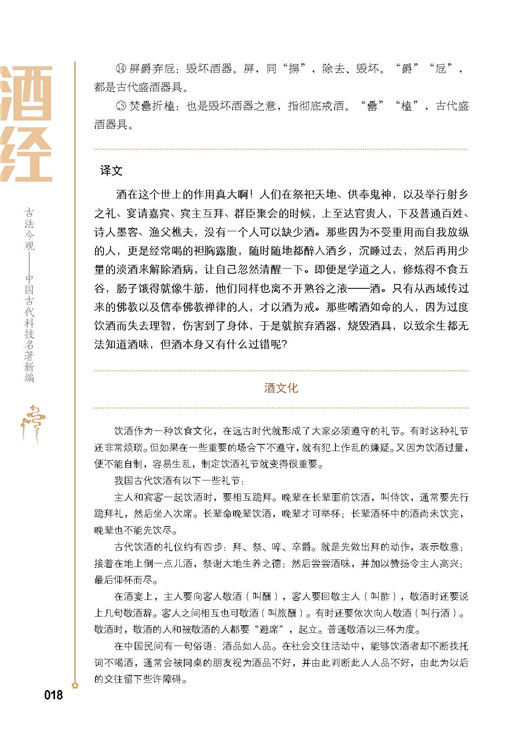 本书着重讲述了中国酒文化的内容,既有对中国酒文化的高度概括和论述,同时又提供了具体的制曲、酿酒方法以及如何榨酒、收酒、贮存酒。本书对其原典进行了精准的注释和翻译,方便读者在了解酿酒知识的基础上,进一步了解中国博大精深的酒文化。由此,使本书既具有科学实用性,也具有一定的文化性。