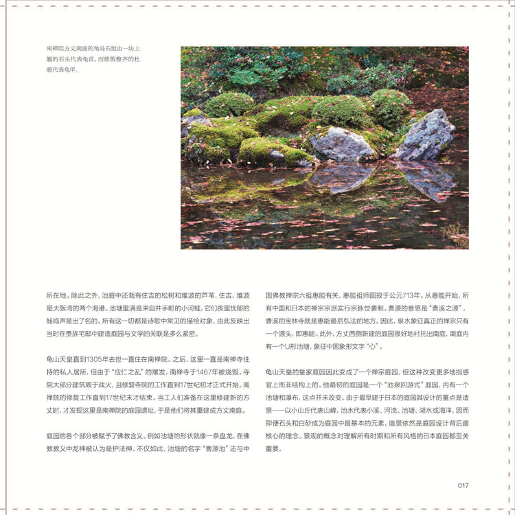 本书配合英国花园摄影师Alex Ramsay的精美图片,介绍了日本禅宗庭园的发展历史。作者试图通过追寻这段历史,来展现不同文化跨越时空的融合,包括古代与现代,本土与外来。内容上主要讲述了如何催生出多元化的日本庭园设计传统,并且如何将其影响力扩展到佛教寺院的范围之外,以及禅宗庭园中的景观设计手法。此外,另有一章专门探讨禅境景观与日本茶庭的关系,并介绍庭园中具有重要价值的树木与灌木等细节设计。