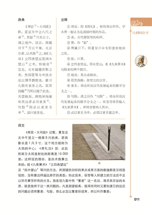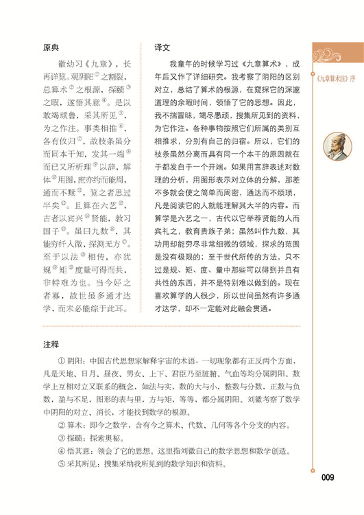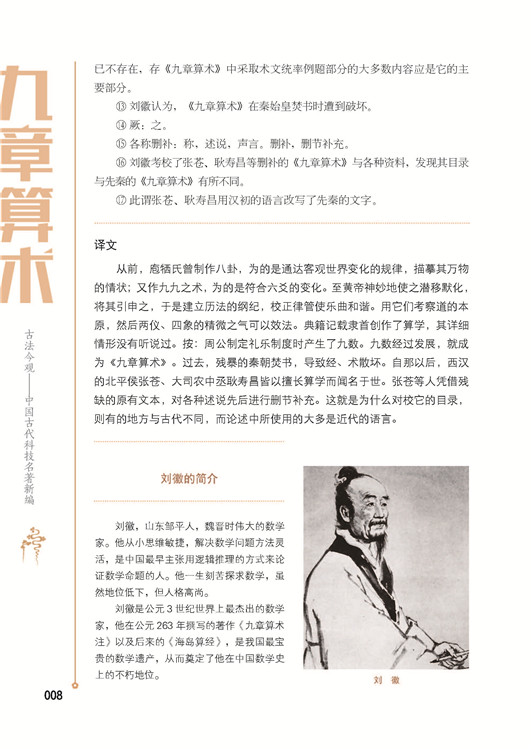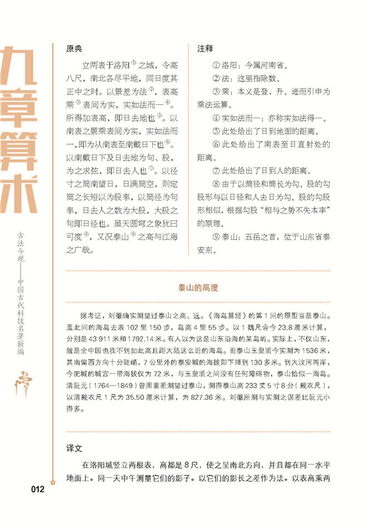 《九章算术》是中国古代数学专著,是算经十书中重要的一种。该书系统总结了战国、秦汉时期的数学成就。全书采用问题集的形式,收有246个与生产、生活实践有联系的应用问题,其中每道题有问(题目)、答(答案)、术(解题的步骤,但没有证明),有的是一题一术,有的是多题一术或一题多术。本书对其原典进行了精准的注释和翻译,方便读者进一步了解中国古代在数学方面的先进水平。由此,使本书既具有科学的实用性,也具有一定的文化性。