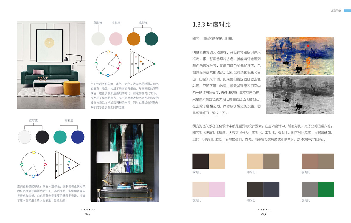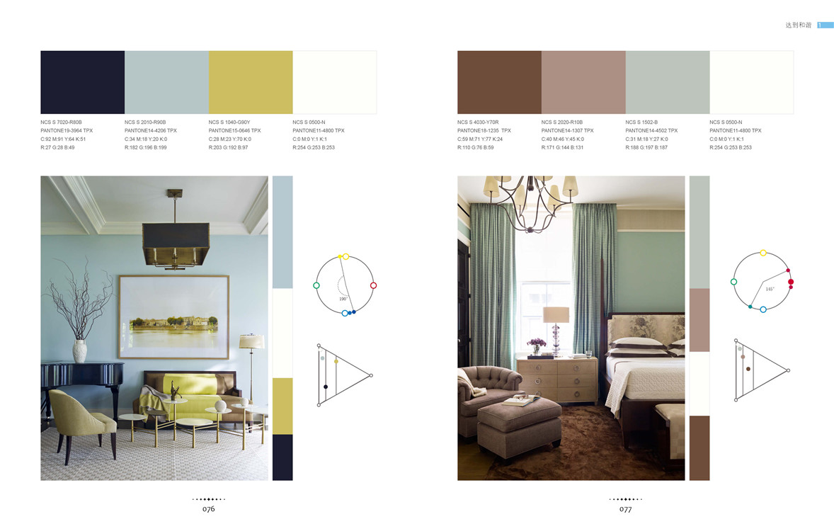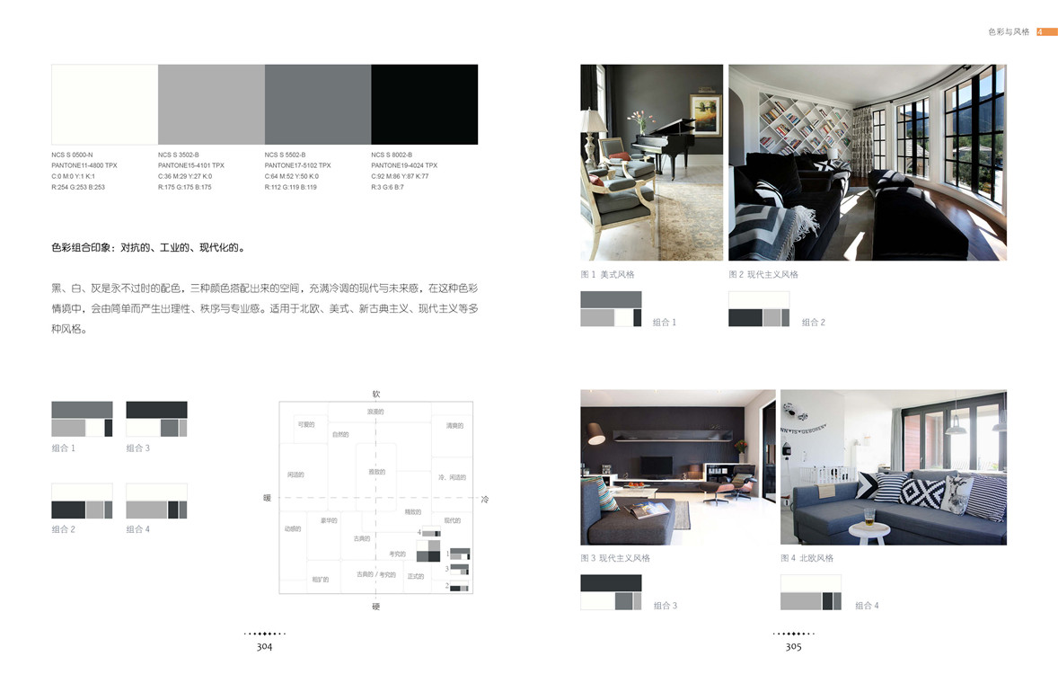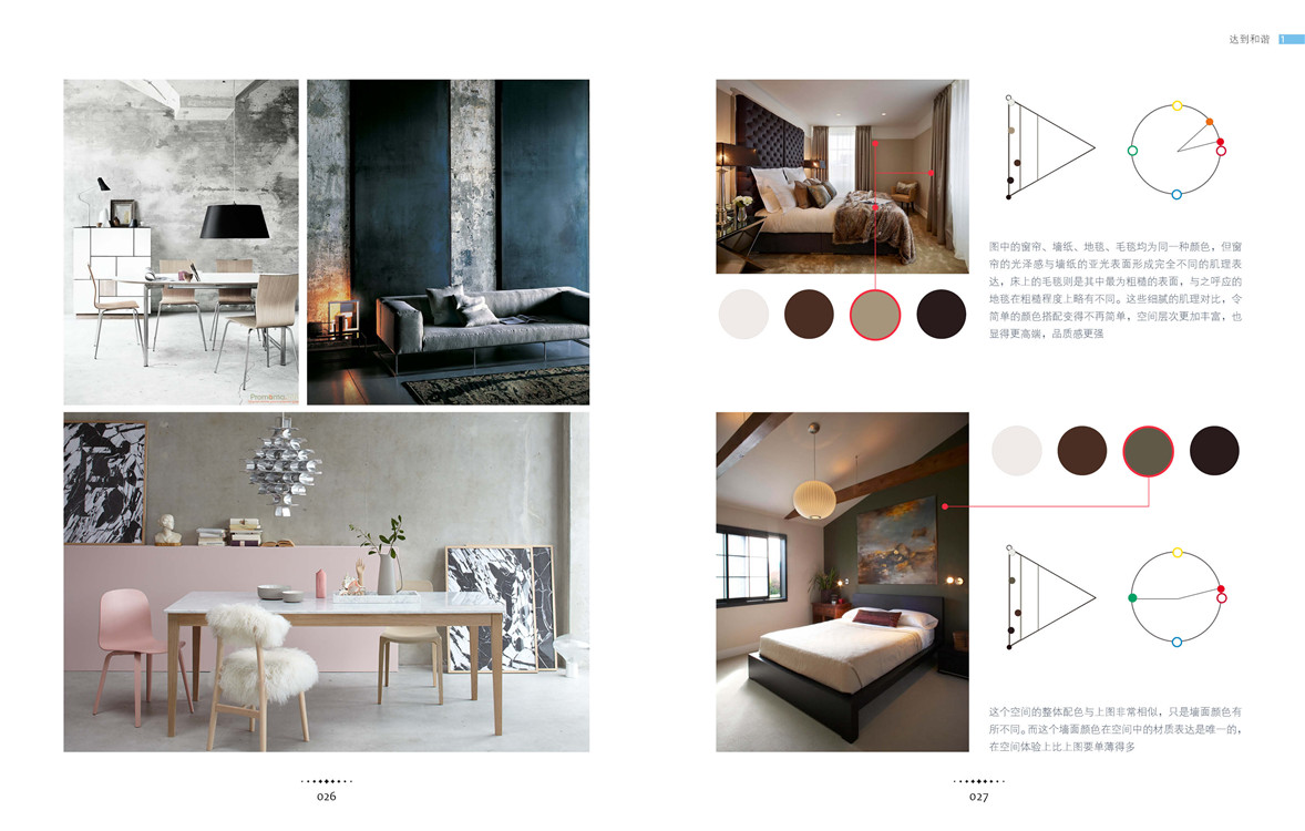 第四章则为读者揭示纷繁复杂的风格本质,总结风格的色彩特征,同时也让读者看到,同样的色彩组合能够表达不同的室内风格。在室内环境中,通过色彩组合所营造出的氛围,基本上就已经能够确定风格的基调。而对时下流行“风格”的认知偏差,往往成为设计师与业主之间沟通的障碍。本章对当下流行的风格做概括性的溯源,总结各种风格的典型色彩搭配特征,便于读者在实践时更灵活地操作。