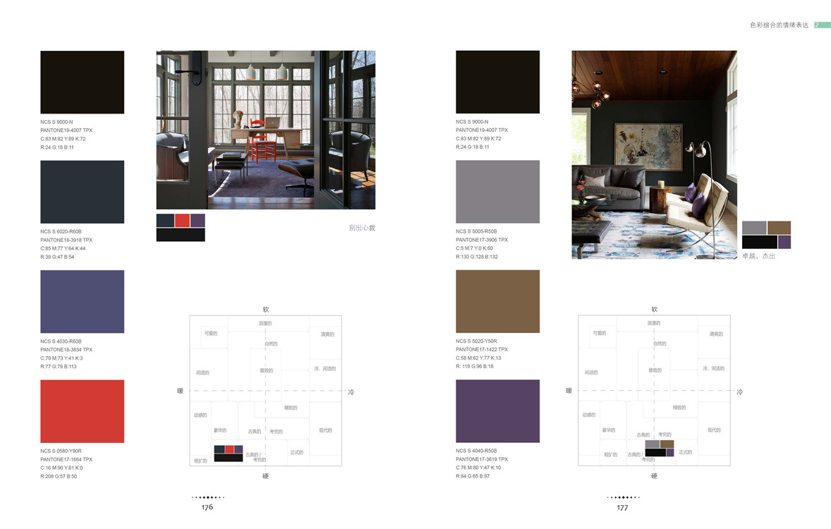 第二章通过量表,将抽象的情感感受落实到具体的色彩组合之中,色彩是衡量人的喜好和情感的标尺。然而,人们对色彩的喜好往往与某种社会因素或个性因素有关,在实际的设计中,某一种颜色永远不可能孤立存在;