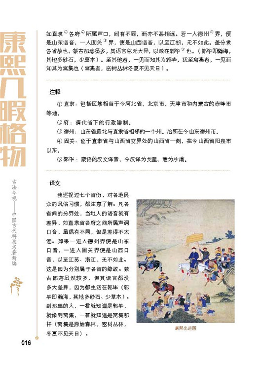 古代帝王给我们留下的文化遗产中,除了建筑遗迹外,更多是他开疆辟土、获取天下、治理天下的策略和过程的文字资料。众所周知,我国古代重文轻理,帝王们留下的大都是文史典籍,科普典籍非常少有。被称为“千古一帝”的康熙皇帝,在闲暇时,却用笔记的形式,对一些科学文化现象进行调查、实验,其中有不少独到的见解,内容涉及天文、地理、古生物、动物、植物、医药、哲学等各个门类—— 一代帝王有这样的科学探索经历是非常罕见的。