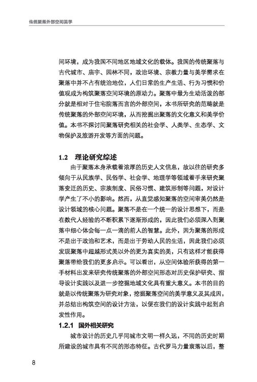 本书对传统聚落的审美体系进行总结,以唤醒弥留在人们心底的审美意识;同时系统的提出聚落外部空间设计方法,一方面可以在聚落设计实践中起到一定的启发作用,另一方面在于以传统聚落研究为载体,并通过时代的手段再现给人们空间美学的魅力。