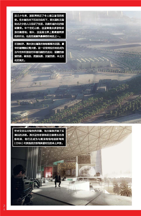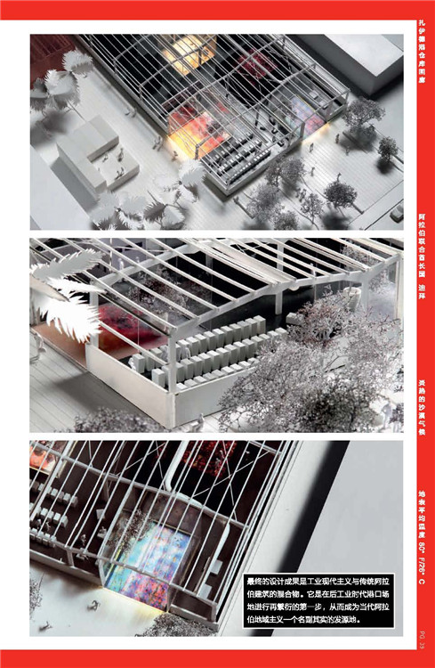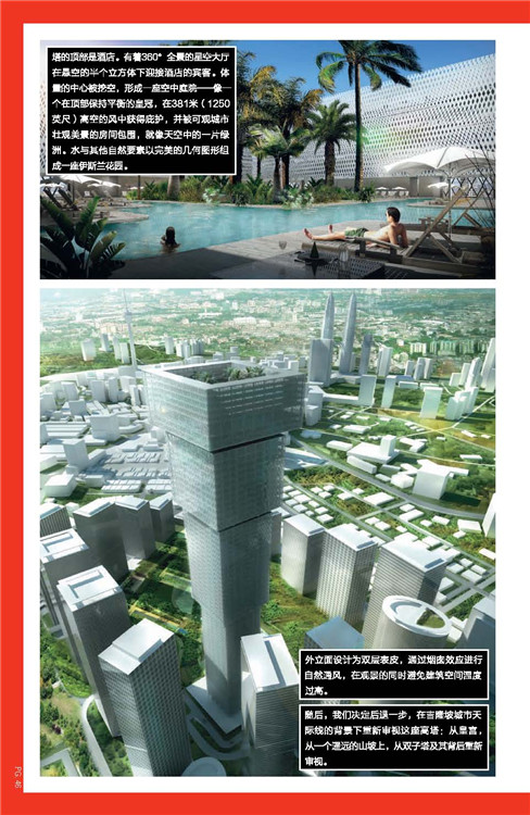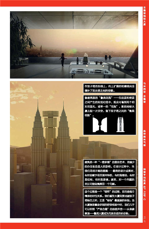 本书采用了一个富有吸引力的设计,其全书贯通的从红到蓝渐变的颜色如同彩虹,来代表从热带到寒带的地理位置变动,并在每页的边缘标注其项目所在地的温度,使读者在翻阅时产生一定的心理暗示。内容结构安排也和书名相贴切,把项目按照从位于世界极热的地区(波斯湾)到极冷的地区(欧洲西北部)的顺序来编排,这种线性的利用使读者能够更系统的理解和记忆每一个项目的地理环境和社会人文等。每个项目都加以描述性文字,讲述项目相关的设计和建造背景,介绍其设计理念等,丰富了读者的阅读乐趣。