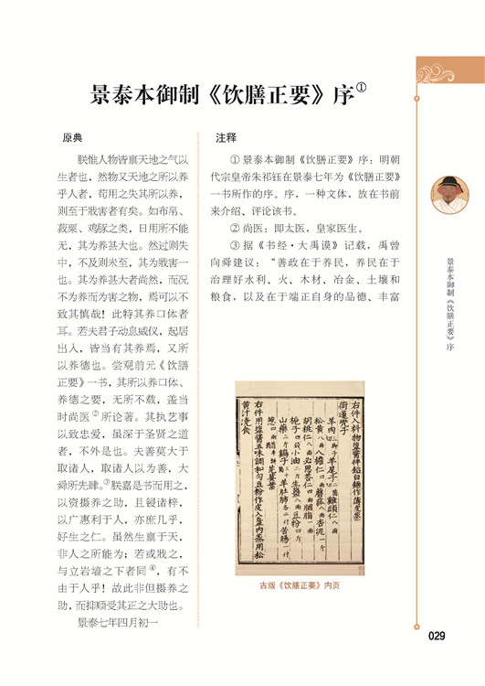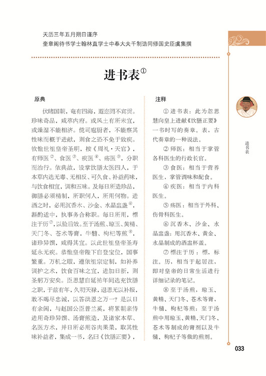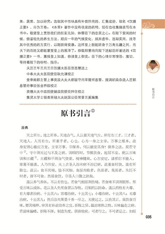 《饮膳正要》一书为元朝·饮膳太医忽思慧所撰的一部营养学专著,全书共三卷:卷一讲的是诸般禁忌,聚珍品撰;卷二讲的是诸般汤煎,食疗诸病及食物相反中毒等;卷三讲的是米谷品,兽品、禽品、鱼品、果菜品和料物等。该书记载药膳方和食疗方非常丰富,特别注重阐述各种饮撰的性味与滋补作用,并有妊娠食忌、乳母食忌、饮酒避忌等内容。它从健康人的实际饮食需要出发,以正常人膳食标准立论,制定了一套饮食卫生法则。书中还具体阐发了饮食卫生,营养疗法,乃至食物中毒的防治等。为我国现存一部完整的饮食卫生和食疗专书,也是一部颇有价值的古代食谱。
