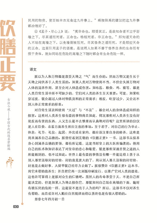 本书《古法今观——中国古代科技名著新编 饮膳正要》除了保留典籍原貌,更加入了注释和译文,把原典中晦涩难懂的内容进行了现代文的翻译,使读者能够无障碍的轻松阅读,并在此基础上引入现代营养学知识,把古时一些囿于条件限制未能全面了解的知识和错误的观念进行了全面正确的阐述,使读者既能了解古人对食物营养的追寻,更能利用更先进的手段寻找出替代品和更优化的食品,使营养学知识更丰富,更能为今人强身健体、驱除疾病所用。