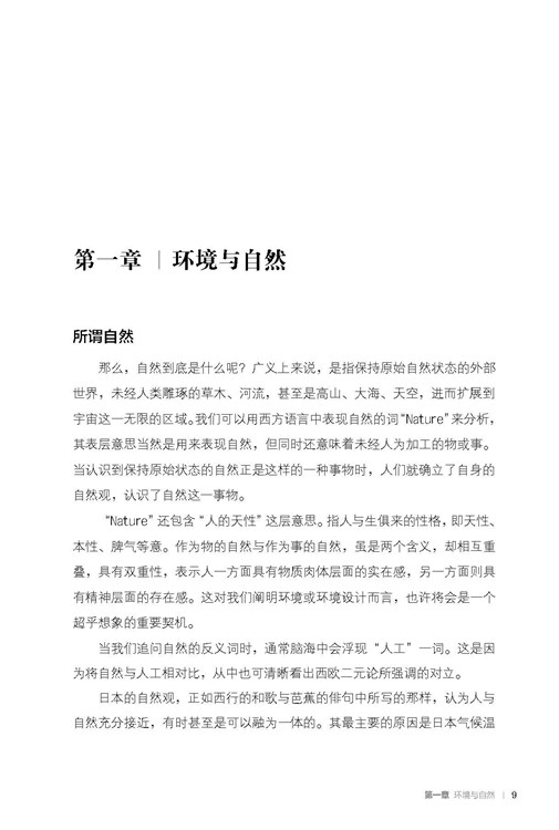 “Nature”还包含“人的天性”这层意思。指人与生俱来的性格,即天性、本性、脾气等意。作为物的自然与作为事的自然,虽是两个含义,却相互重叠,具有双重性,表示人一方面具有物质肉体层面的实在感,另一方面则具有精神层面的存在感。这对我们阐明环境或环境设计而言,也许将会是一个超乎想象的重要契机当我们追问自然的反义词时,通常脑海中会浮现“人工”一词。这是因为将自然与人工相对比,从中也可清晰看出西欧二元论所强调的对立。