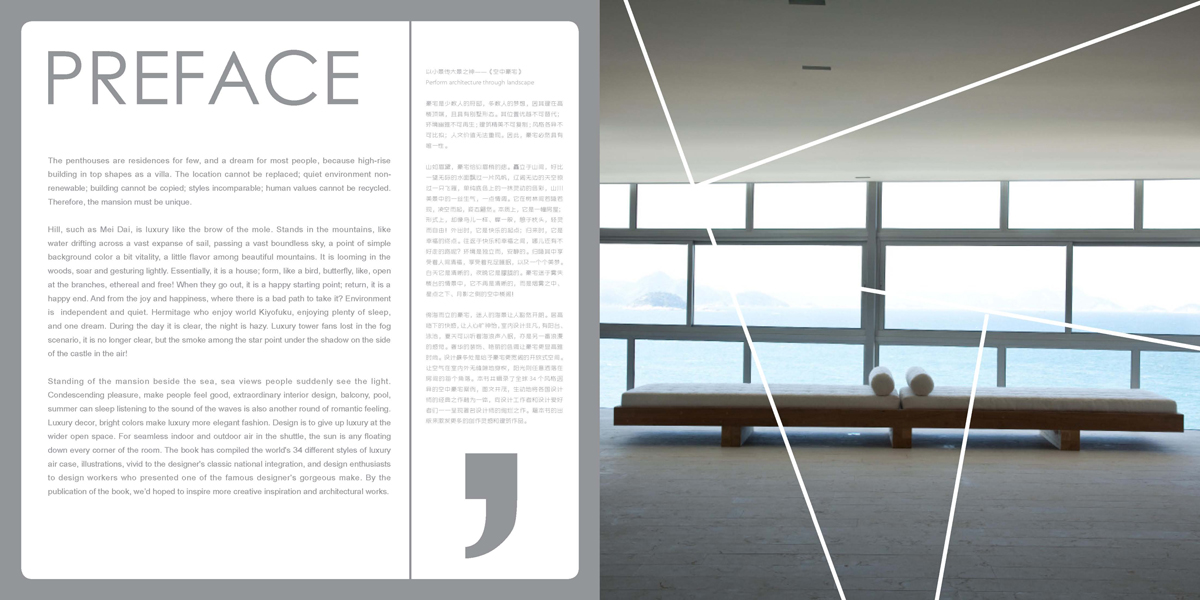 《都市桃源——空中豪宅》主要以世界各大城市市区高层高级住宅区得样板豪宅为主,现在全球包括中国在内的许多城市土地都非常稀少在市区的住宅主要倾向于高层住宅,现代城市人的生活水平在不断提高,许多成功人士对生活品味极致追求,悬在半空中豪华舒适居所,让人焕发了儿时般得梦幻即“梦幻天堂”的生活方式,同时一种居高临下仰望美景不但显示主人的成功也是至高的生活享受。所以高层中的超级豪宅应韵而生,本书主要讲叙就是一些知名城市的高层中的豪宅项目,像纽约,旧金山,伦敦,巴黎,首尔,新加坡,马尼拉,香港,台湾,上海,东京等各大城市的一些高层豪宅案例,本书将能给设计师提供许多低层或高层豪宅项目学习参考的灵感。