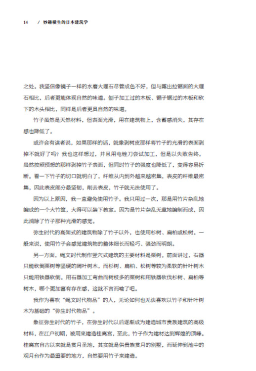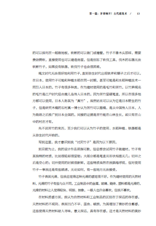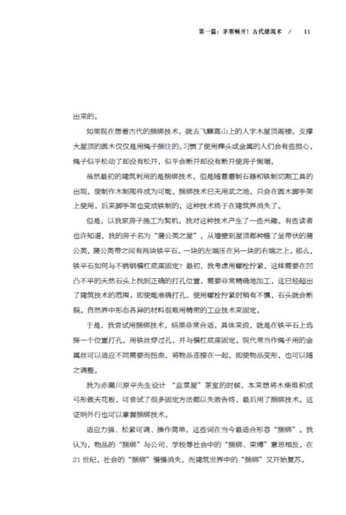 这本书是一本妙趣横生的建筑学入门书。书中收录了筑摩书房《天下无双的建筑学入门》连载与大成建筑《藤森教授恍然大悟的建筑入门》连载中的37篇文章。作者在书中分为两部分介绍了建筑学,即古代建筑的技术和住宅建筑的功能。藤森照信在书中以风趣且通俗易懂的语言详细地地讲述了日本古代建筑技术,包括对石器、捆绑技术、竹子、树上住宅、地基、柱子、草顶房屋等古代技术;第二部分则详细的讲解了包括住宅、建材、门户、地板、榻榻米、走廊、天花板、照明、窗户、厨房、楼梯、阳台、围墙、庭院等现代住宅建筑的功能。