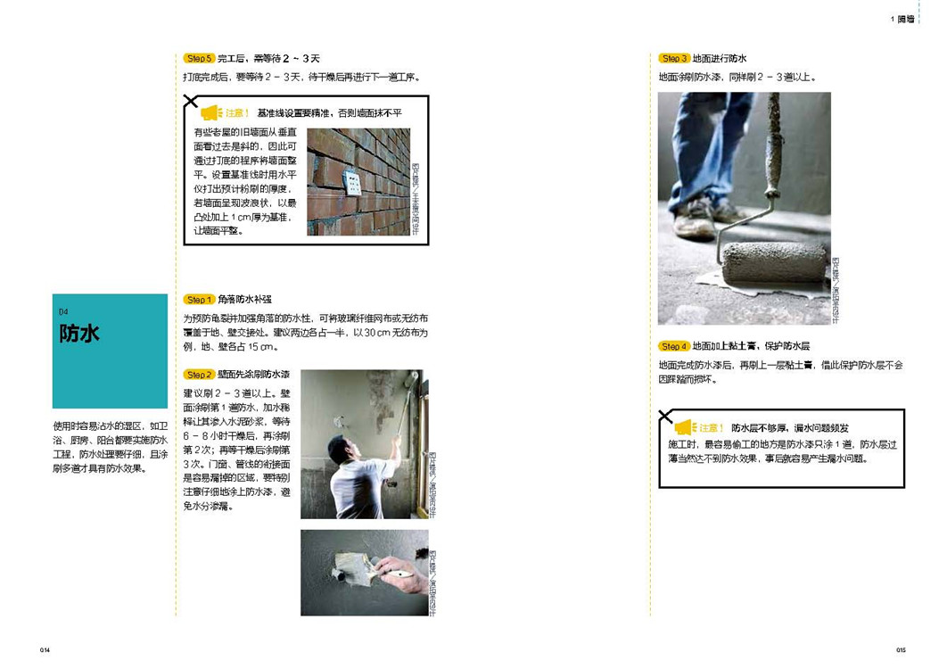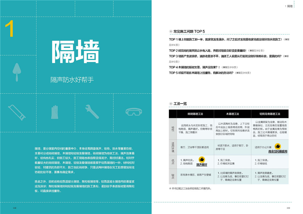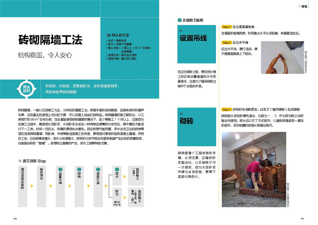讲解工法正确步骤,列出重点步骤,施工更安心;解析不同工法差异,了解适用环境,才能对症下药;揭露施工常犯错误,警示工程常见问题,确保施工顺利;阐释材质各自特性,同种材质也有施工差异,顺应不同材质,改变施工做法。一步骤一图解,拆解基础技法,图解化施工细节,让你一看就懂,轻松搞定施工难题。