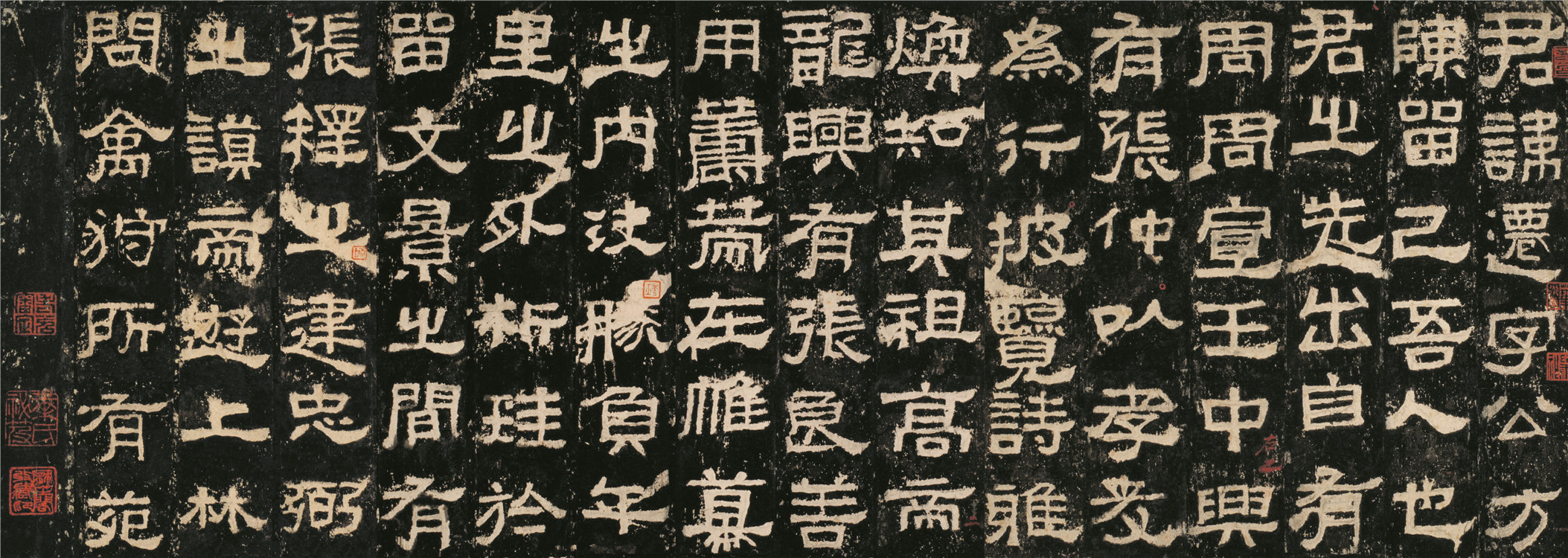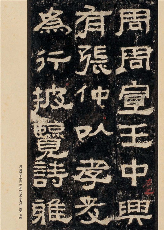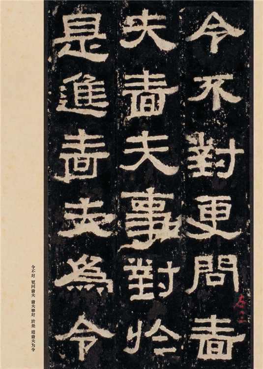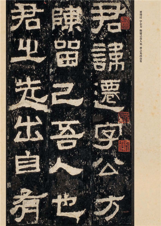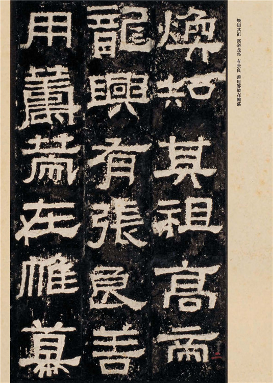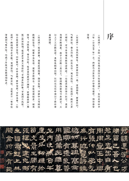 《张迁碑》个性风格突出,属浑厚拙朴一类。道劲雄强,厚重朴拙,气势开张,骨力洞达,朴实无华,高古脱俗。《张迁碑》的刻工并不精细,对书丹有明显的改造痕迹,一些笔画凿刻得不到位,甚至有漏刻的现象。由于工匠的二度加工,该碑既存原有书丹成分,又加上了工匠的改造,虽略显粗率拙陋,但却在无形中增加了质朴率真的情趣。