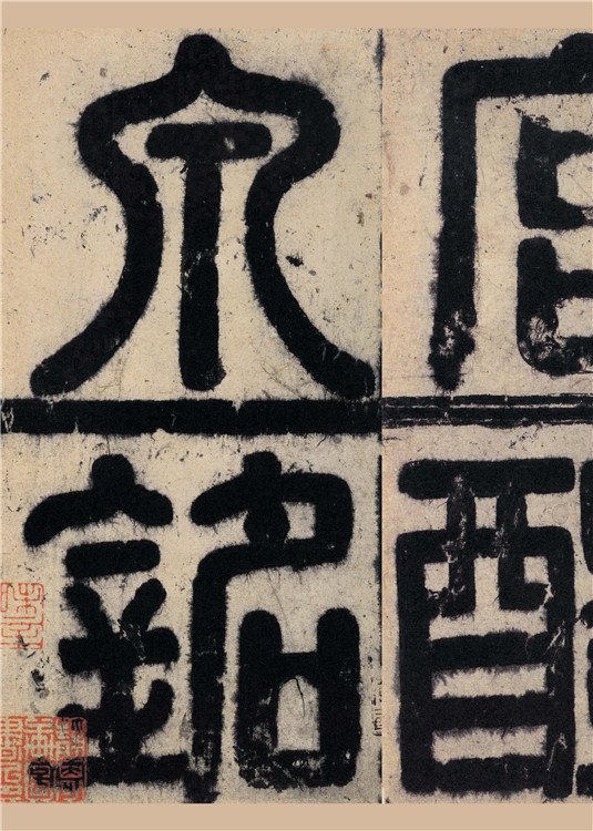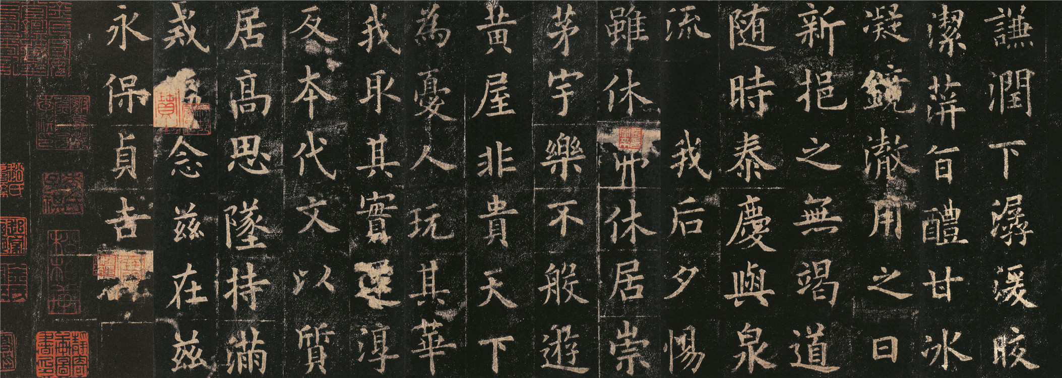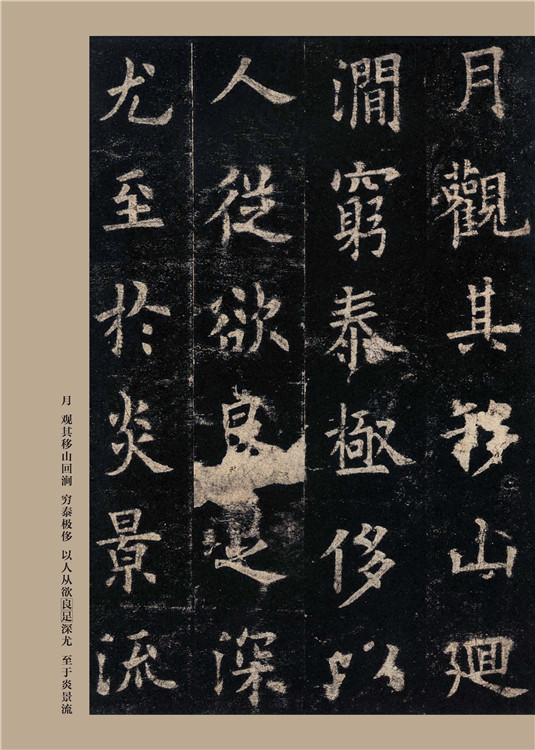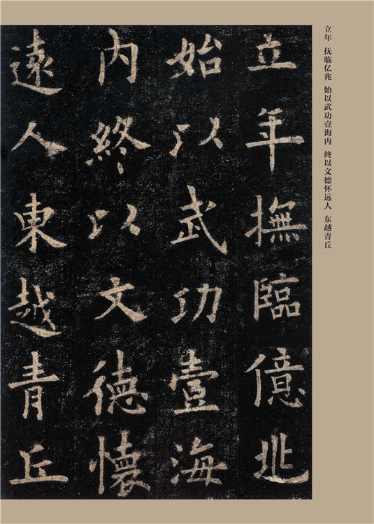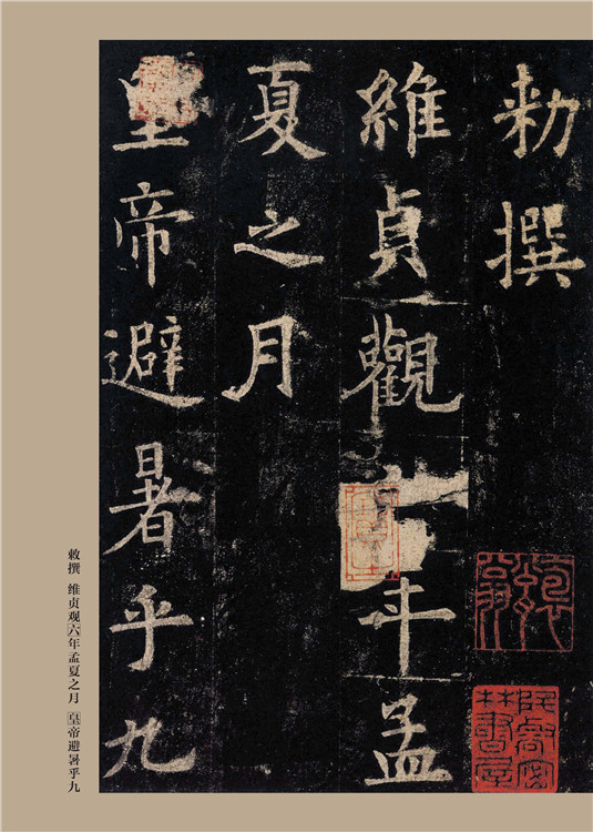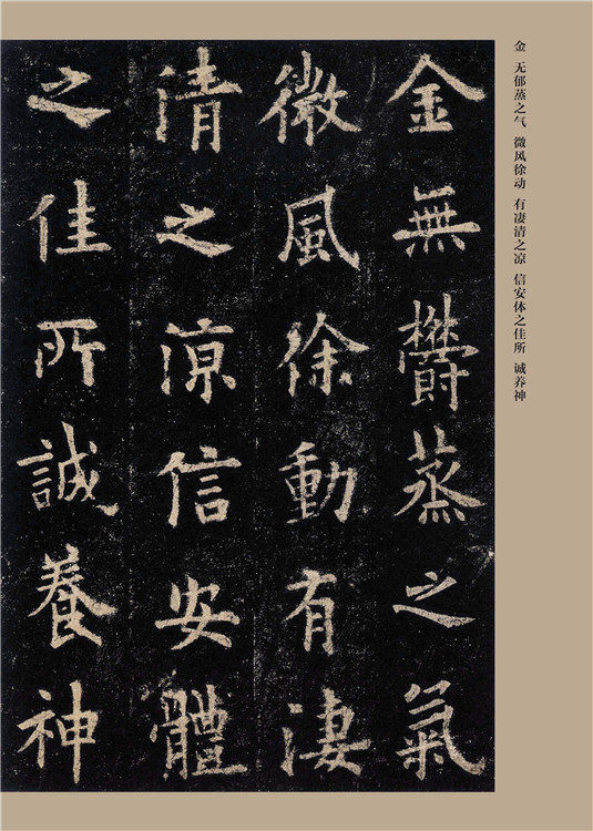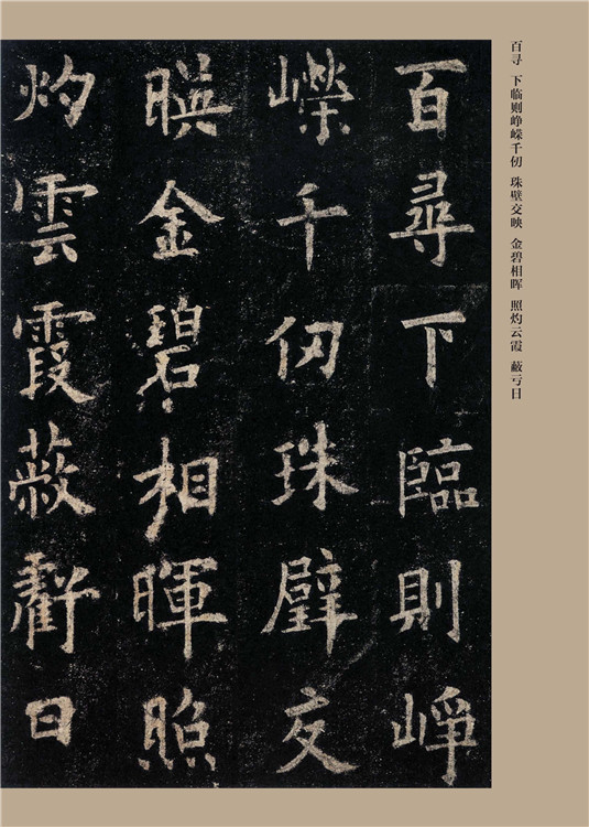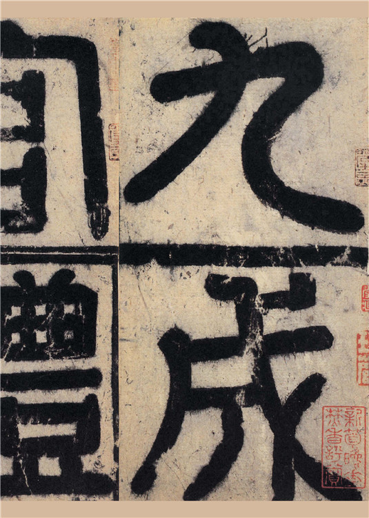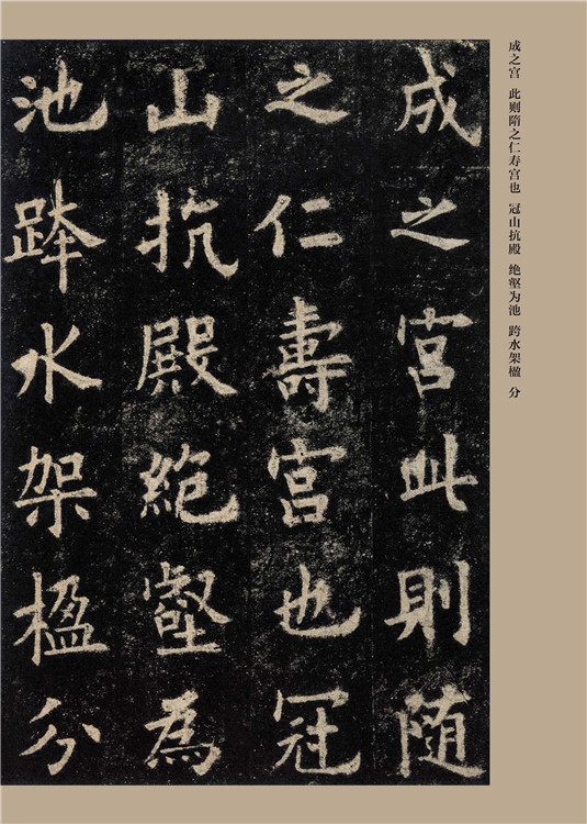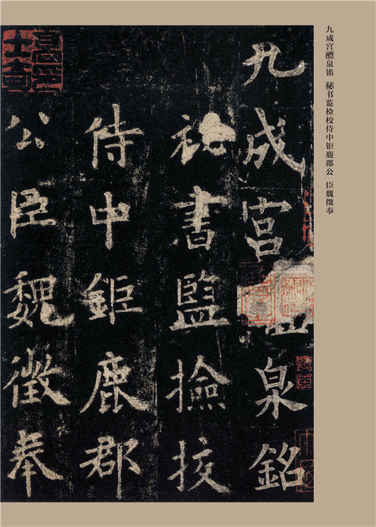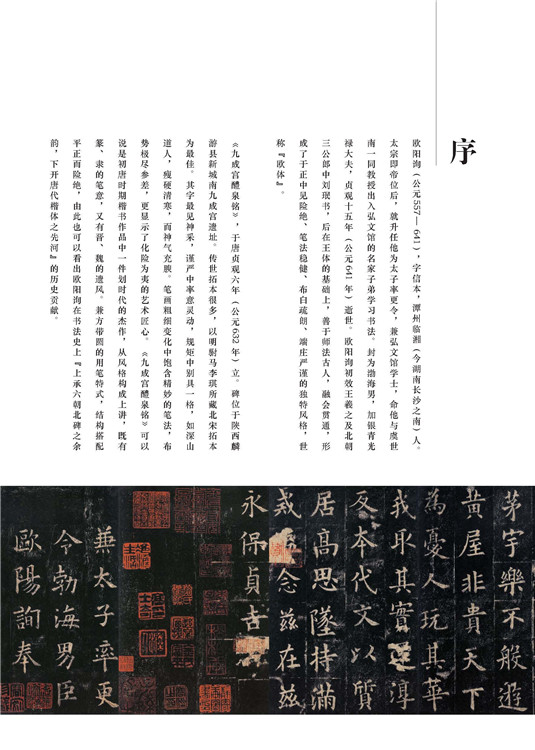 《九成宫醴泉铭》,于唐贞观六年(公元632年)立。碑位于陕西麟游县新城南九成宫遗址。传世拓本很多,以明驸马李琪所藏北宋拓本为最佳。其字最见神采,谨严中率意灵动,规矩中别具一格,如深山道人,瘦硬清寒,而神气充腴。笔画粗细变化中饱含精妙的笔法,布势极尽参差,更显示了化险为夷的艺术匠心。《九成宫醴泉铭》可以说是初唐时期楷书作品中一件划时代的杰作,从风格构成上讲,既有篆、隶的笔意,又有晋、魏的遗风。兼方带圆的用笔特式,结构搭配平正而险绝,由此也可以看出欧阳询在书法史上“上承六朝北碑之余韵,下开唐代楷体之先河”的历史贡献。