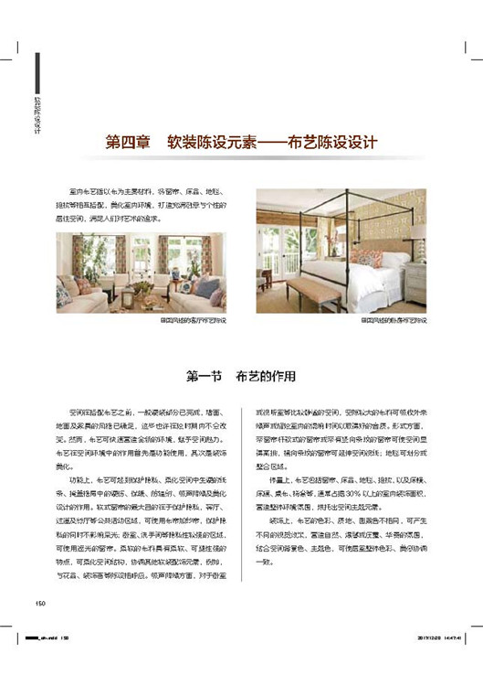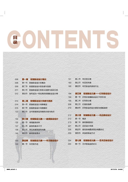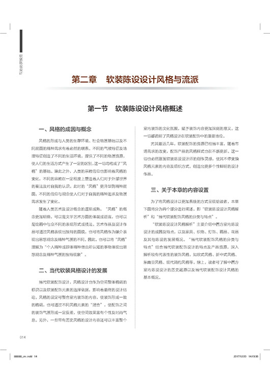 为了将风格设计以更加系统的方式呈现给读者,本章下面将分为两个部分进行阐述,即“软装陈设设计风格解析”和“当代软装配饰风格的分类与特点”。“软装陈设设计风格解析”主要介绍中西方室内陈设设计的成因及特点,以及家具、织物、灯饰、画品、花品及其他陈设的发展概况。“当代软装配饰风格的分类与特点”结合当代软装配饰设计的特点及产品资源,深入解析较有代表性的装饰风格,如欧式风格、新中式风格、东南亚风格、现代简约风格等。综上,读者可了解中西方室内陈设设计的历史起源以及当代软装配饰设计风格的基本概况。