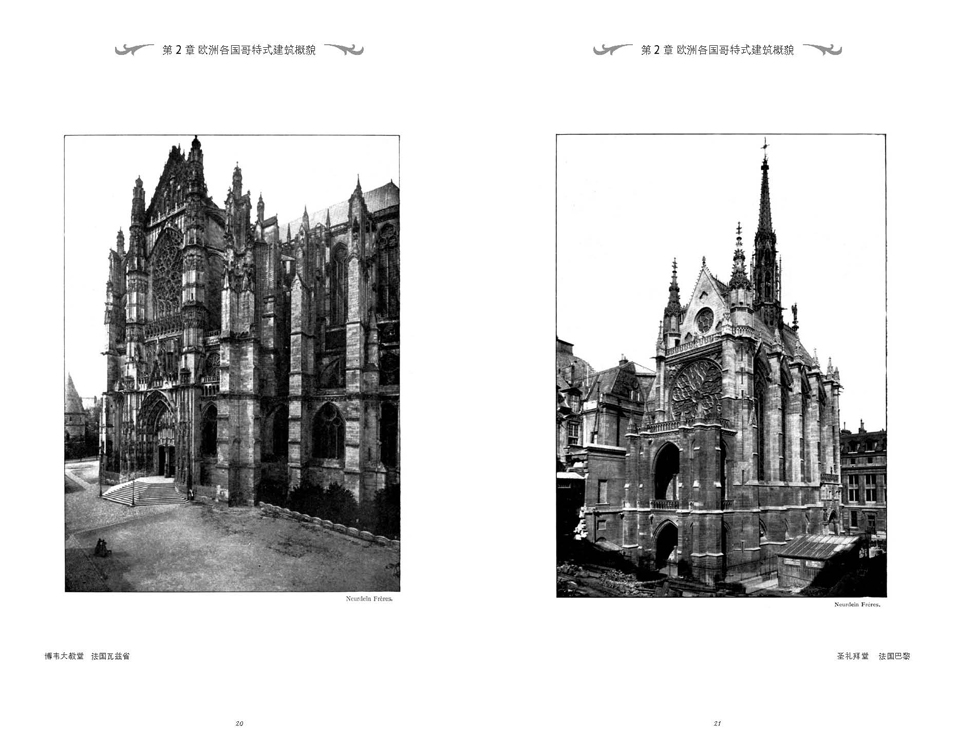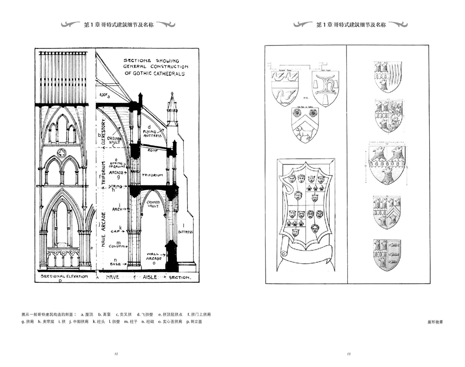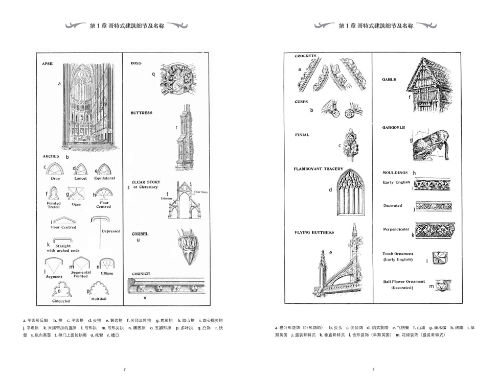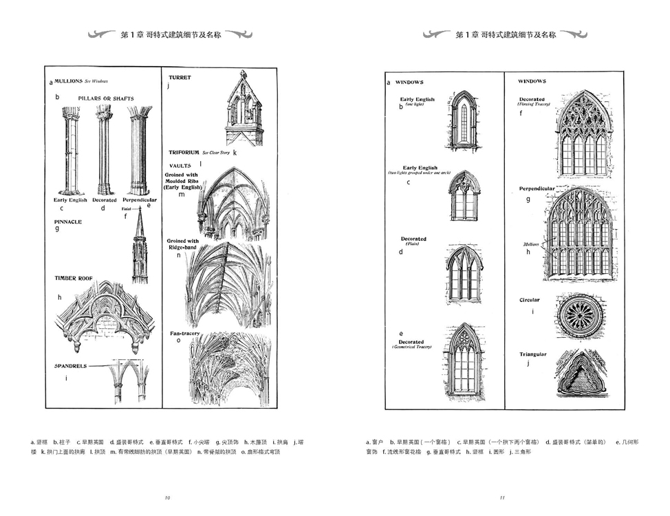 本卷共分为三个部分:第一部分对哥特式建筑的代表性构件进行简明扼要地图注式介绍,通过这几页的内容,能让读者对哥特式建筑的分类有个感性的认知;第二部分为欧洲各国哥特式建筑的概貌,收集了法国、英国、比利时、德国和奥地利、意大利以及西班牙等国的哥特建筑,每个建筑展示一张全景老照片;由于英国的哥特建筑独具代表性,第三部分用较大篇幅(约占全书的80%)展示英国各地区哥特式建筑详细图纸,这些图纸主要是建筑设计,包含建筑的整体平立剖面图,建筑特色构件的局部详图,部分图纸有完整的尺寸标注。