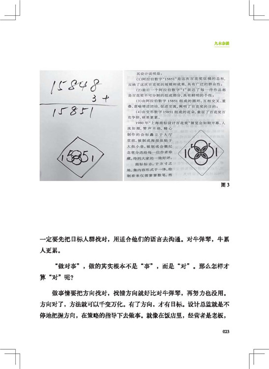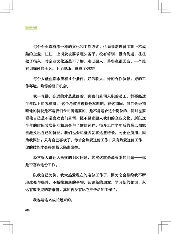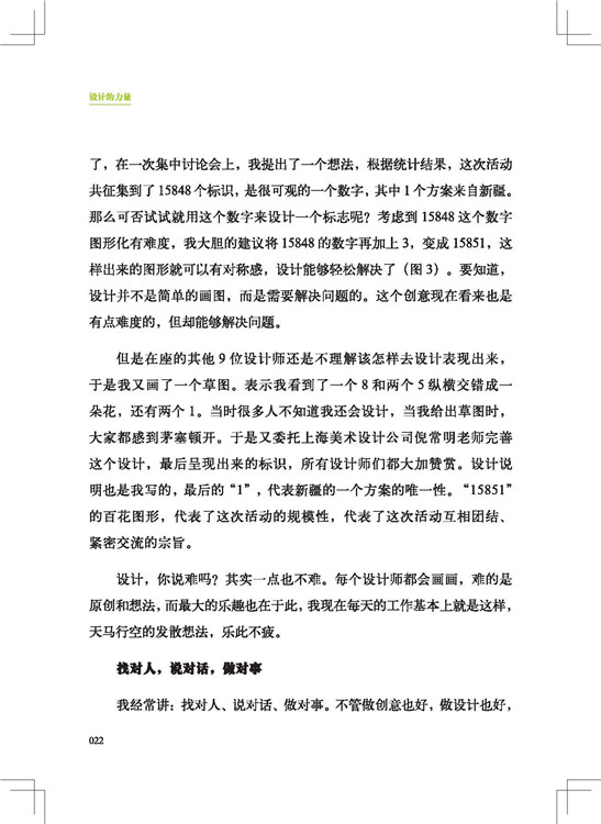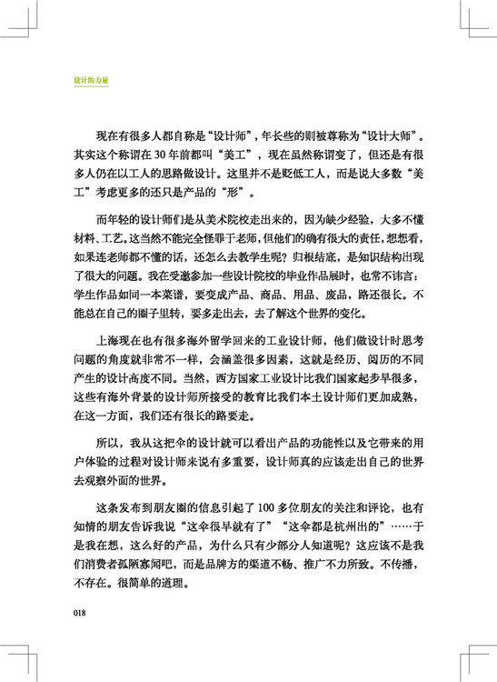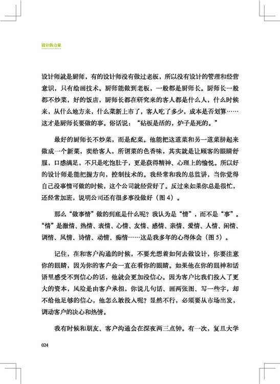 这本书以访谈形式来分享作者职业生涯中的设计项目经验,讲解其亲身经历的大项目过程,展示其几十年总结的独有的创意观。通过十个话题来讲述设计师对平面设计、产品设计以及室内设计的理解与感受,以及用户的体验态度。并深入浅出地道出设计的理念,直击设计的本质。这也是树立品牌形象,传播品牌影响力,积累品牌资产的核心要素。同时作者还提到了创造性思维在设计中的重要性,这种思维模式不仅给设计师灵感与启发,同时也给用户满意的体验与享受。