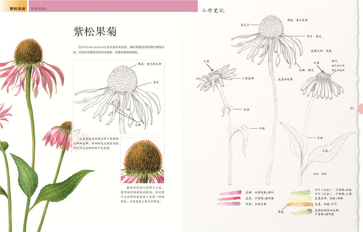 必备的画前准备后,是艺术家对造型和设色的讲解,扫除你的入门疑虑。之后出场的是有充分详解步骤的绘画案例,玫瑰、马蹄莲、鸢尾……你肯定会喜欢。充分的练习后,需要反思总结,艺术家在这里列出上色的六个阶段,这有助于你更精准地使用颜料,帮你走向真正的植物绘画。