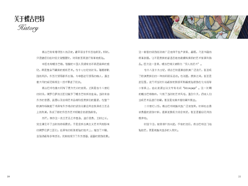 蝶古巴特来自法语Découpage,意为用剪贴画对物品进行装饰。起源于18-19世纪的法国贵族之间乃至宫廷里,流行将当时知名画家的翻版印刷画剪贴装饰在化妆箱等小家具上,从而演变成一种装饰方式。蝶古巴特操作简单,耗时很少,被装饰物品改变度很高,但原料造价很低,基本上只需要一点胶水,一张印花纸巾就能进行。在软装和生活美学大爆炸的当下,蝶古巴特作为既能装饰家居用品、又能改装家居、装饰衣物和包包的手工,渐渐被认识并受到欢迎,甚至部分城市的幼儿园和青少年宫都开设了蝶古巴特课程。