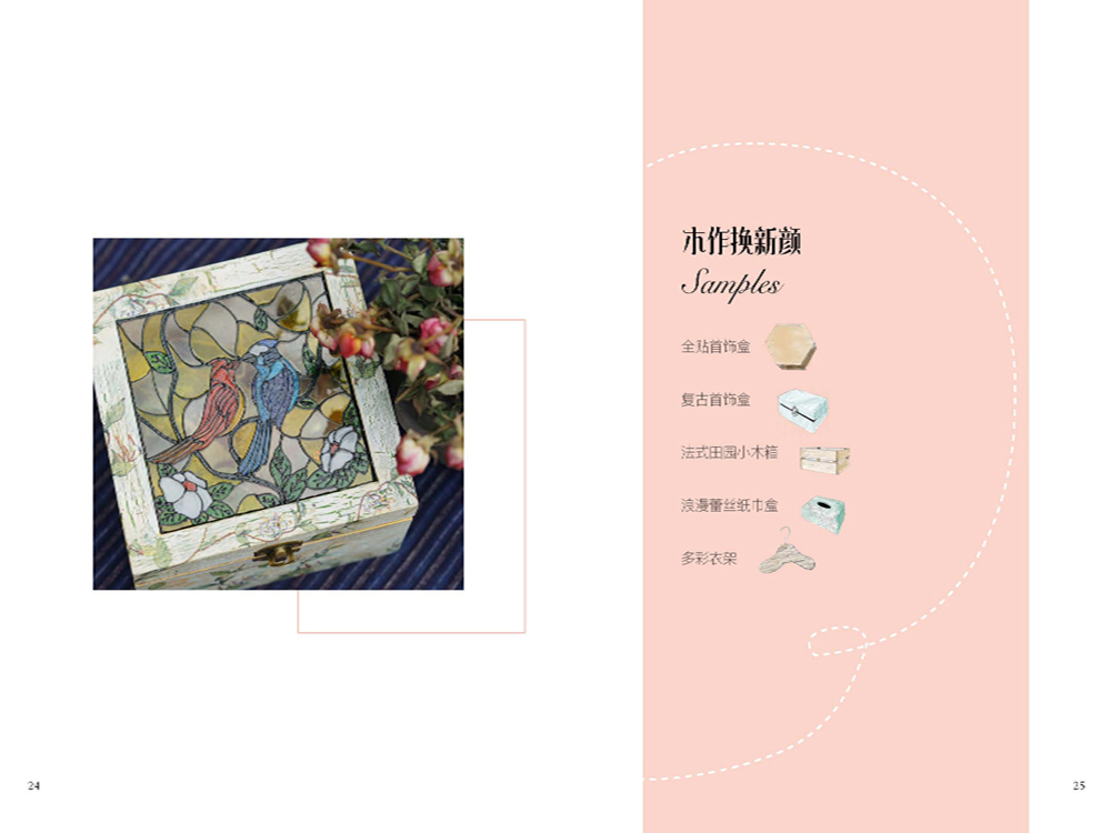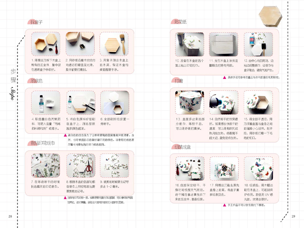 蝶古巴特让不会画画的读者也能成轻松地创作出独居风格的拼贴作品,只要学会且活用蝶古巴特技巧,就可以让贴纸与黏土、蜡烛、金属等其他工艺素材完美结合,让读者根据自己的喜好做出具有灵感的拼贴作品!《蝶古巴特—— 浪漫拼贴轻松做》共分为5部分内容,第一部分作者讲述了蝶古巴特的来源;第二部分讲解了蝶古巴特的所用到的材料工具,这部分内容将所用到的工具分为6种;第三部分为木作换新颜,主要讲述了5个案例,全贴首饰盒、复古首饰盒、法式田园小木箱、浪漫蕾丝纸巾盒、多彩衣架;第四部分蜡烛华丽变身,为读者详细解读了印花蜡烛、干花蜡烛杯、干花蜡烛 3个案例,第五部分旧物改造,其中详细讲解了薰衣草小布包 、复古圆盘钟、装饰小挂板、咖啡罐的改造、复活节小彩蛋、照片转印6个案例教程。