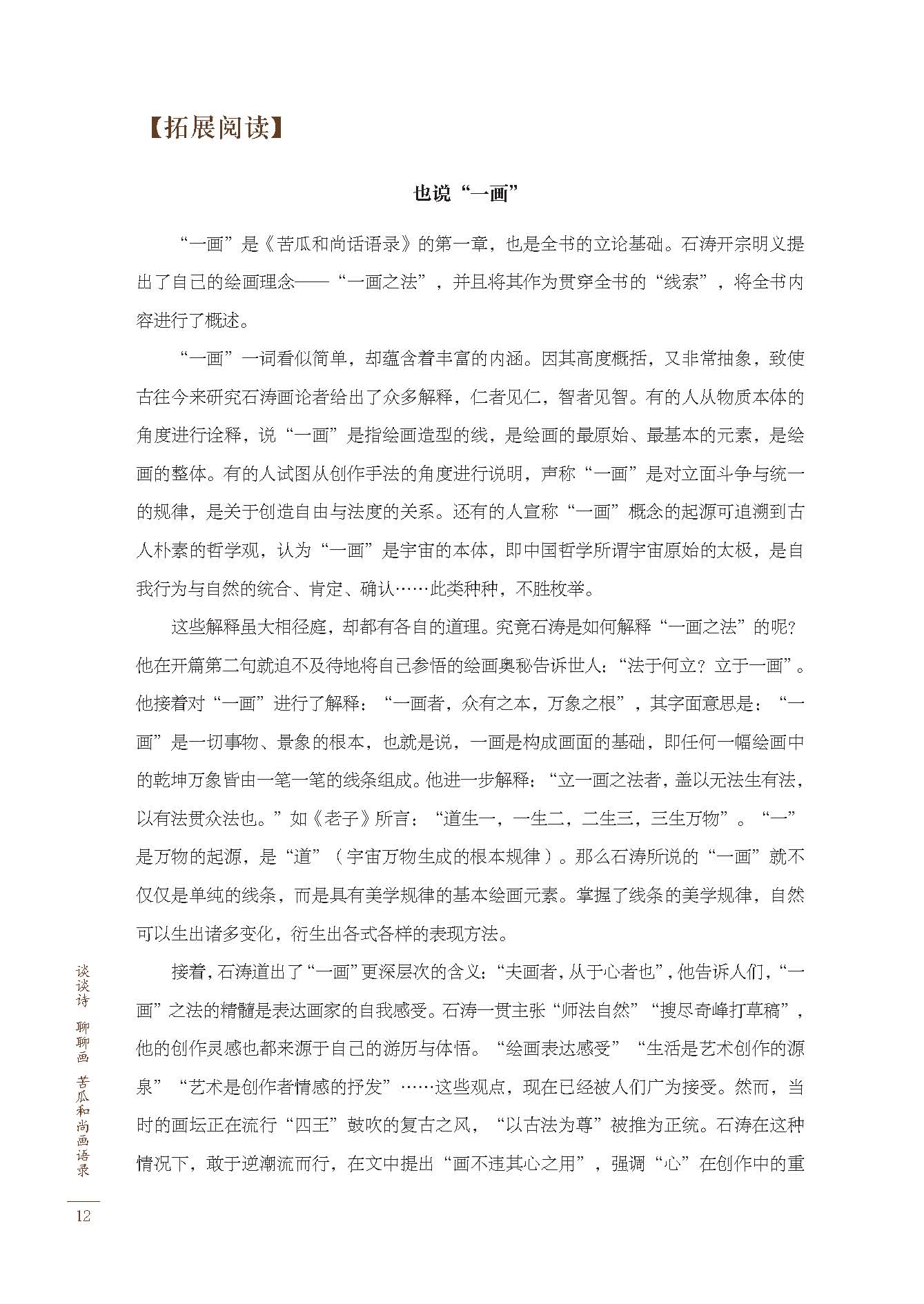 为了使读者更全面地了解石涛的绘画理论,本书在每个篇章之后附短文一篇作为拓展阅读,内容涉及石涛的人生经历、艺术生涯、生平趣事及其画论、画作,以及他在其他艺术领域取得的成就等,全方位地为读者介绍了这位画坛巨匠。