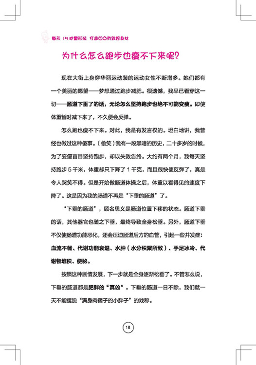 本书以女性身体不断下垂的苦恼开篇,通过分析人体肠道的功能和运作方式,得出肠道决定体重和体型的结论。接着,详细解说作者研发的15秒美肠操,让肠道回到原本的位置。“基础肠道体操”排出体内废物,减轻体重,“局部体操”重塑体型,打造凹凸有致好身材。此外,再搭配使肠道不下垂的生活方式和食物集锦,收获不下垂的生活品质。最后,收录美肠沙龙女子座谈会,东京的模特纷纷感叹改变肠道位置可以改变人生。