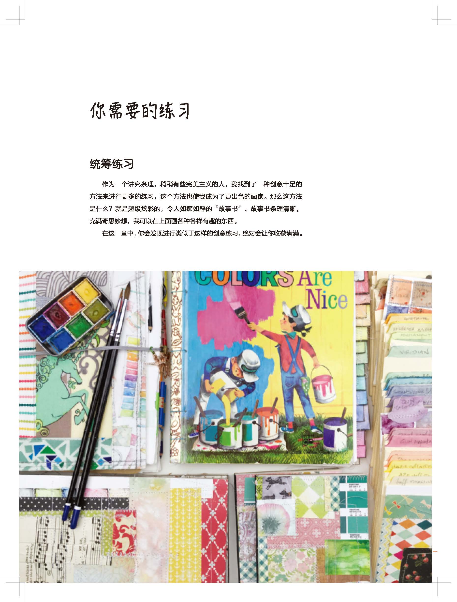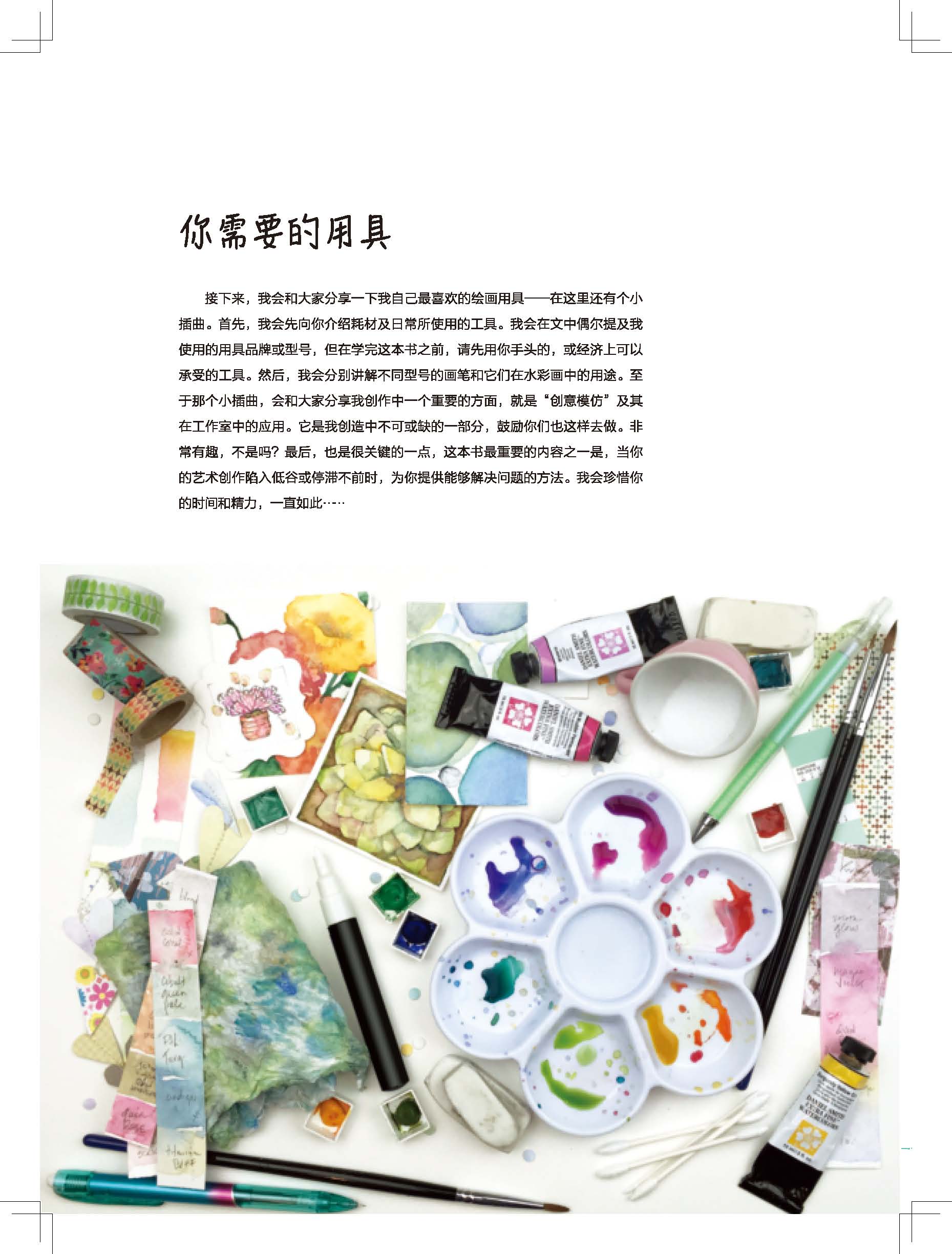 丹妮尔·唐纳森是一位热爱奇思妙想的艺术家,但并不放纵恣肆。你可以在书中感受到她自律又自由的个性。这对初学水彩的爱好者来说实在太棒了!她为我们编著的这本《少女心的水彩日记》值得反复研究玩耍,书中从工具的统筹准备开始,系统讲述了为了不同目标的练习你需要做的事,比如封胶水彩本用于日常练习,创意练习本用于色彩练习……她创造的打卡练习系统最终汇成你在水彩学习之路上的一本本“故事书”。而且让人惊喜的是,丹妮尔会利用拼布,蕾丝,各种小零碎作为创作灵感进行创作,其中的小心思她都毫无保留地告诉了我们。