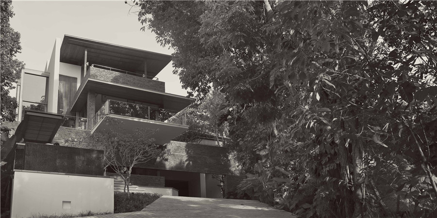 达曼海悬崖边上。我们的视觉焦点在于这些别墅独特的屋顶形式,以及这些屋顶对泰国文化背景的体现。位于新加坡纳森路的住宅展现出私人性质与公共性质的二元性。在这里,娱乐空间和私人生活空间实际上被分割成两栋独立的建筑,隔街相对。两栋建筑的建筑语言、规划和空间表现形式就像两位具有鲜明特征的兄妹。相比之下,位于印度尼西亚首都雅加达以南的武吉高尔夫乌塔玛别墅的主题是水资源的利用。鱼塘和游泳池等水景引领着游客开启神奇的体验之旅,使他们