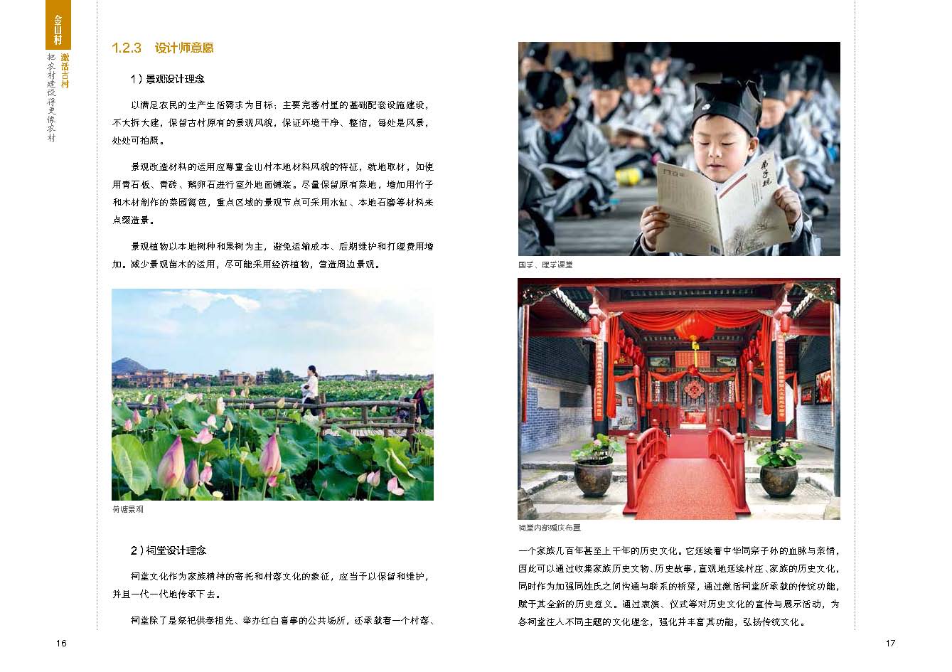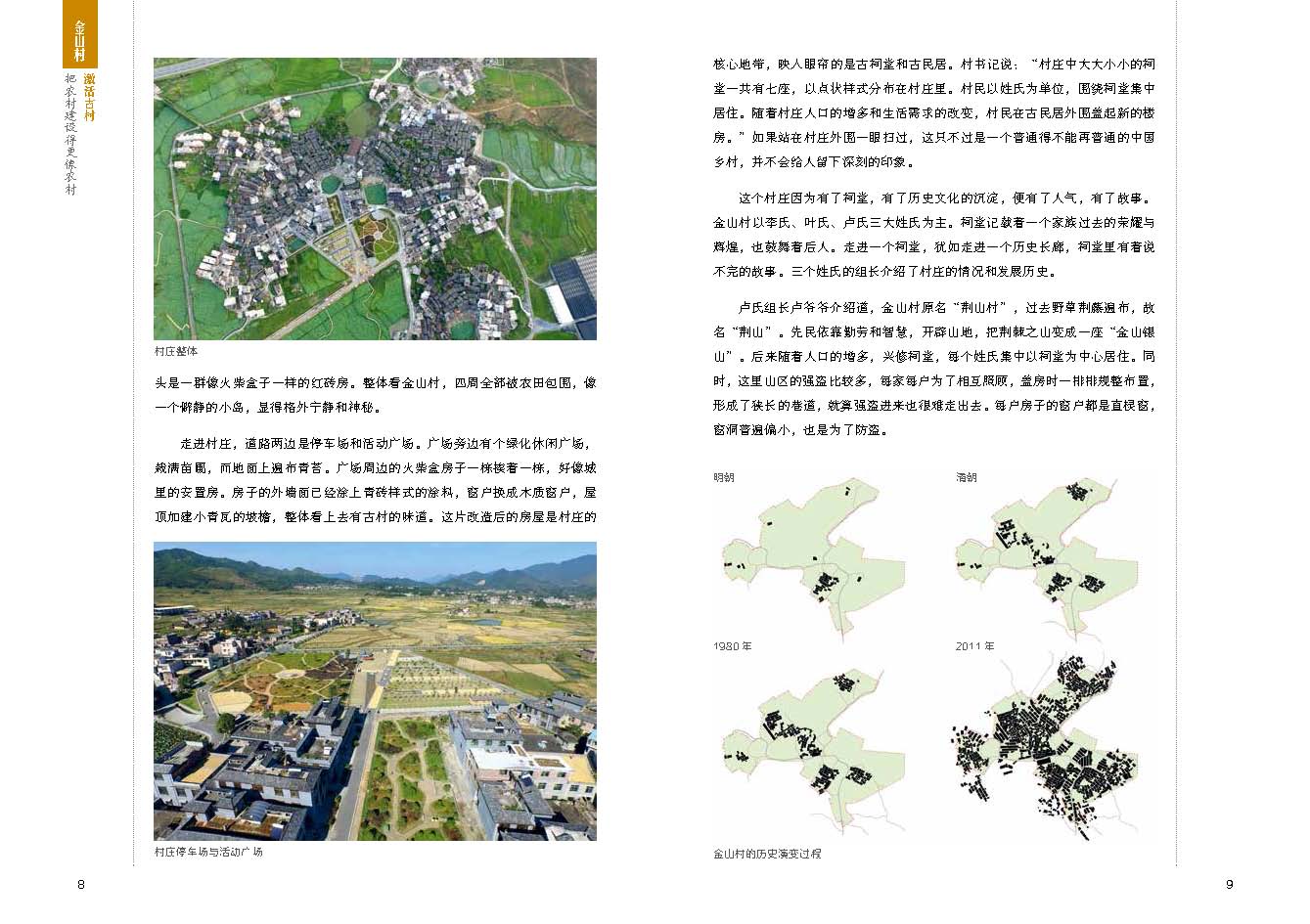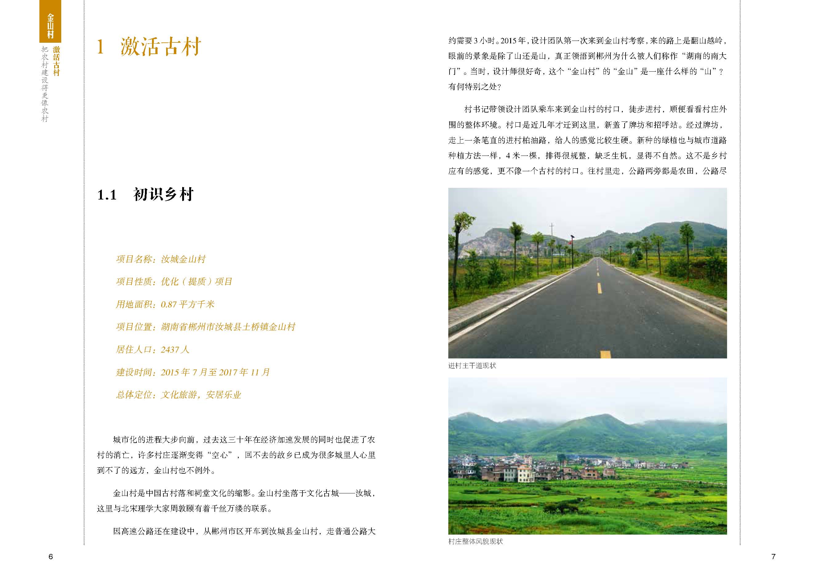 金山村位于湖南省汝城县,是拥有几处国家级和省级祠堂的古村落,有着典型的农村村落特征和祠堂保护的特殊性。设计师从祠堂的修复与保护作为切入点,设计莲花草堂、荷塘景观、村头招呼站、戏台等标志性景观。书中通过实景前后对比图片、设计图纸、模型方案、灯光效果图、手绘图等,让读者不仅能通过文字,还可通过图片来深入了解金山村建设前后的巨大变化。
