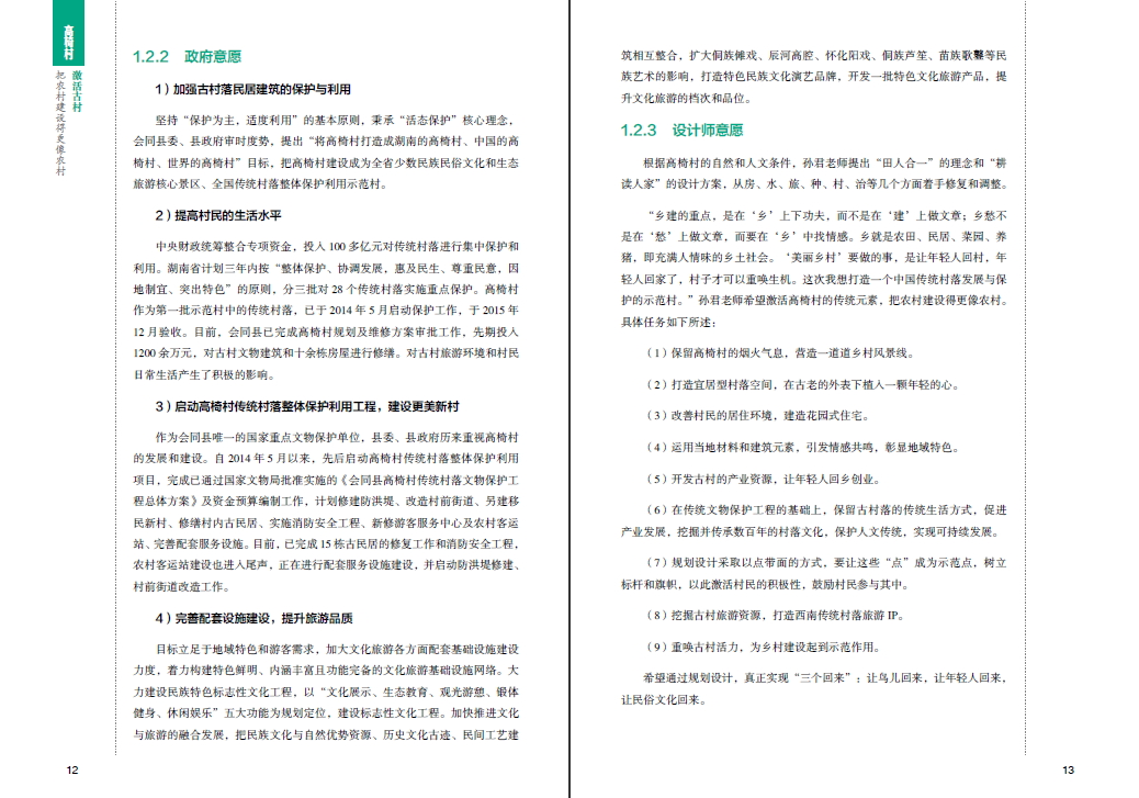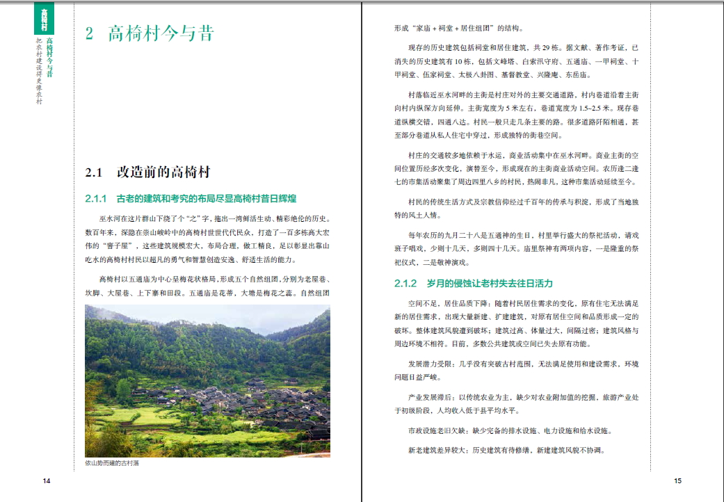 本书展示了设计师如何让发展和保护并行,将有着“中国十大古村落之一”称号的湖南侗族村落高椅村建造成为新旧建筑并存的美丽村庄。书中详细地解答了保护与激活之间存在的矛盾与问题,并通过实际案例分析设计师与村民之间的互助关系,此项目凝聚了清华大学、中央美术学院、中国民族大学等高校师生的智慧,集结了湖南农道、湖南如一设计、农创投资等公司的心血,众志成城,让高椅再活五百年。