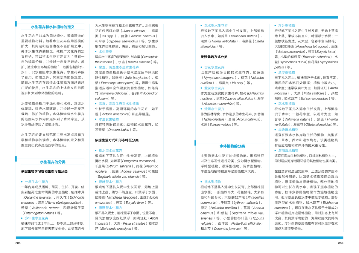 《水体植物景观》按照植物的特性和景观功能分类,分为挺水型植物造景、浮叶型植物造景、漂浮型植物造景、沉水型植物造景、岸边湿地植物造景、滨海湿地植物造景,方便园林从业人员在实际应用中参考借鉴。