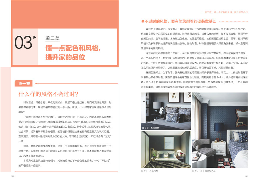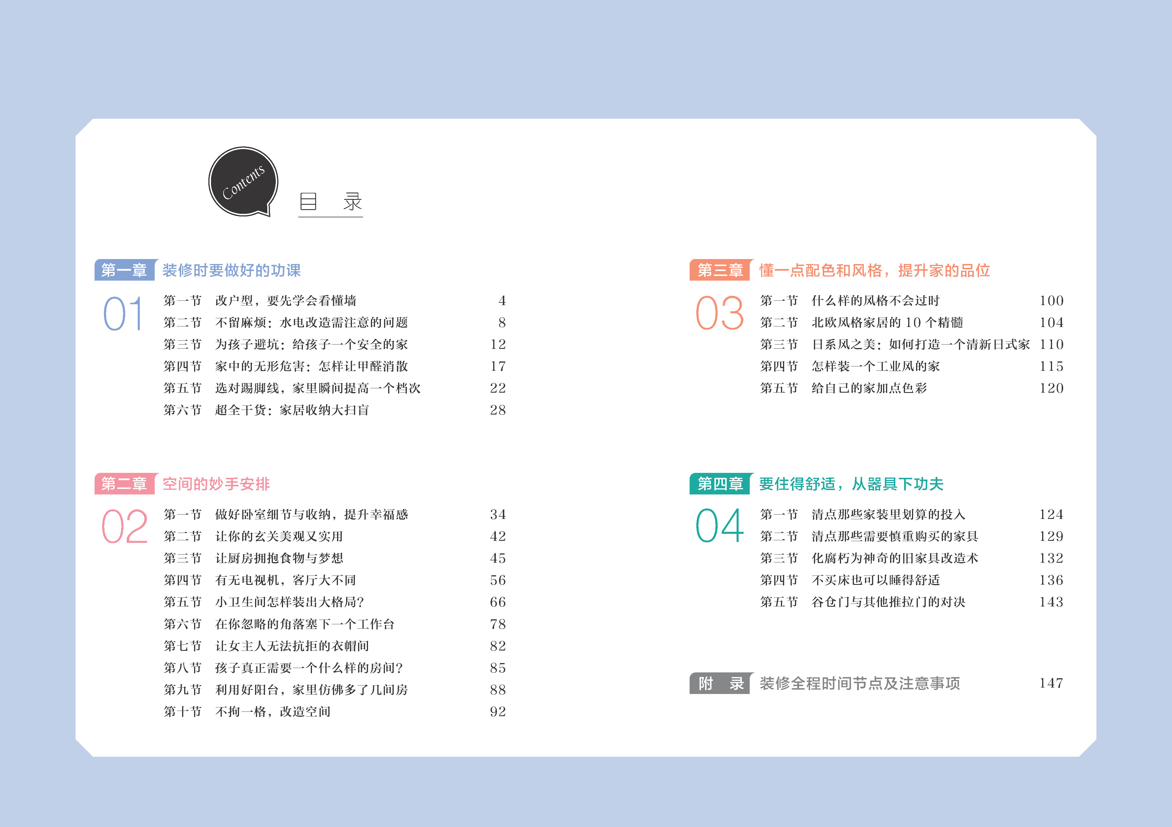 本书分为四部分:第一章为“装修时要做好的功课”,主要讲装修时有哪些地方需要注意,着重于细节;第二章为“空间的妙手安排”,从卧室、客厅、玄关、厨房、卫生间、阳台等分区入手,分别讲解各功能区的一些装修要点和建议;第三章为“懂一点配色和风格,提升家的品味”,主要从风格和配色入手,讲解各种风格的注意事项;第四章为“要住得舒适,从器具下功夫”,主要讲述有哪些实用好看的家具、部件,以及个别家具有哪些地方不尽如人意,需要谨慎购买。