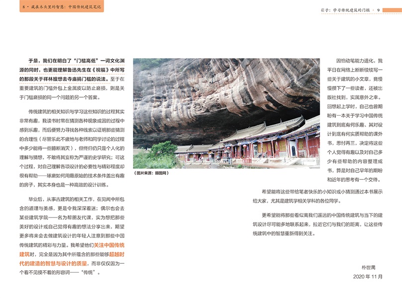 中国传统文化博大精深,传统建筑作为衣食住行中的一个支柱,自是其中重要一环。不过对于想要了解传统建筑的大众读者来说,要么被建筑典籍的古体字及拗口的建筑构件名称所吓退,要么被散文化的优美文字弄得云里雾里。似乎存在一个缺口,即以建筑设计为视角来审视古建筑,从而对当下的建筑设计及生活有所启发。本书试图以建筑设计为视角,回归到人的生活与建造活动。一旦回归到基本的生活及建造,许多曾经习以为常却不知所以然的东西,以及需要耗费心神来记忆的那些知识点,一下子便有趣生动起来。于是,个中的生活智慧、建造智慧便不再是冷冻的过期食品,而是应季的生鲜,对当下的建筑设计更有营养。在此意义上,本书为填补“缺口”贡献了一方木料。