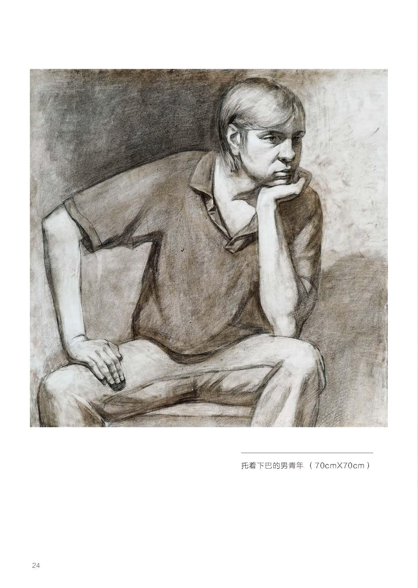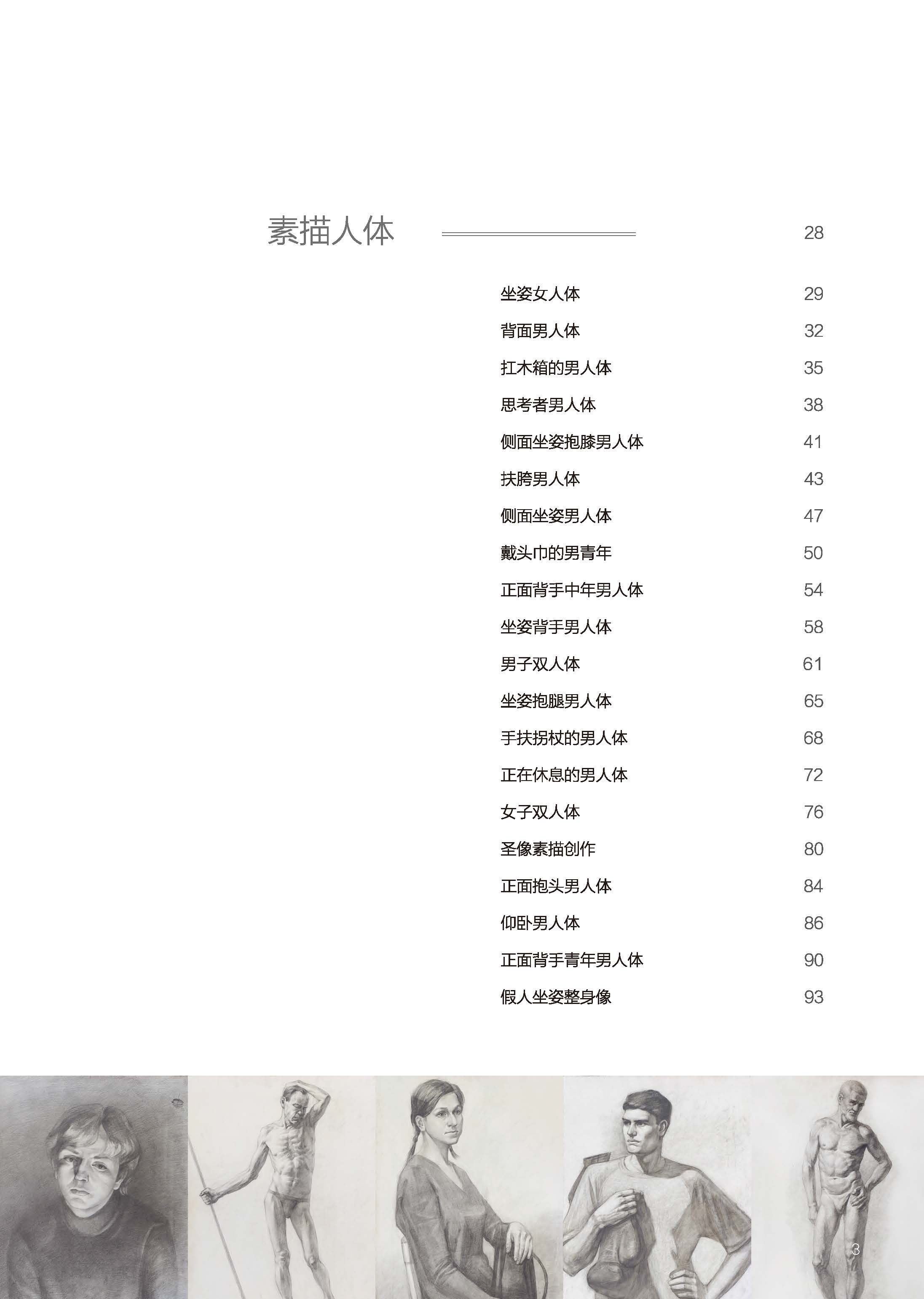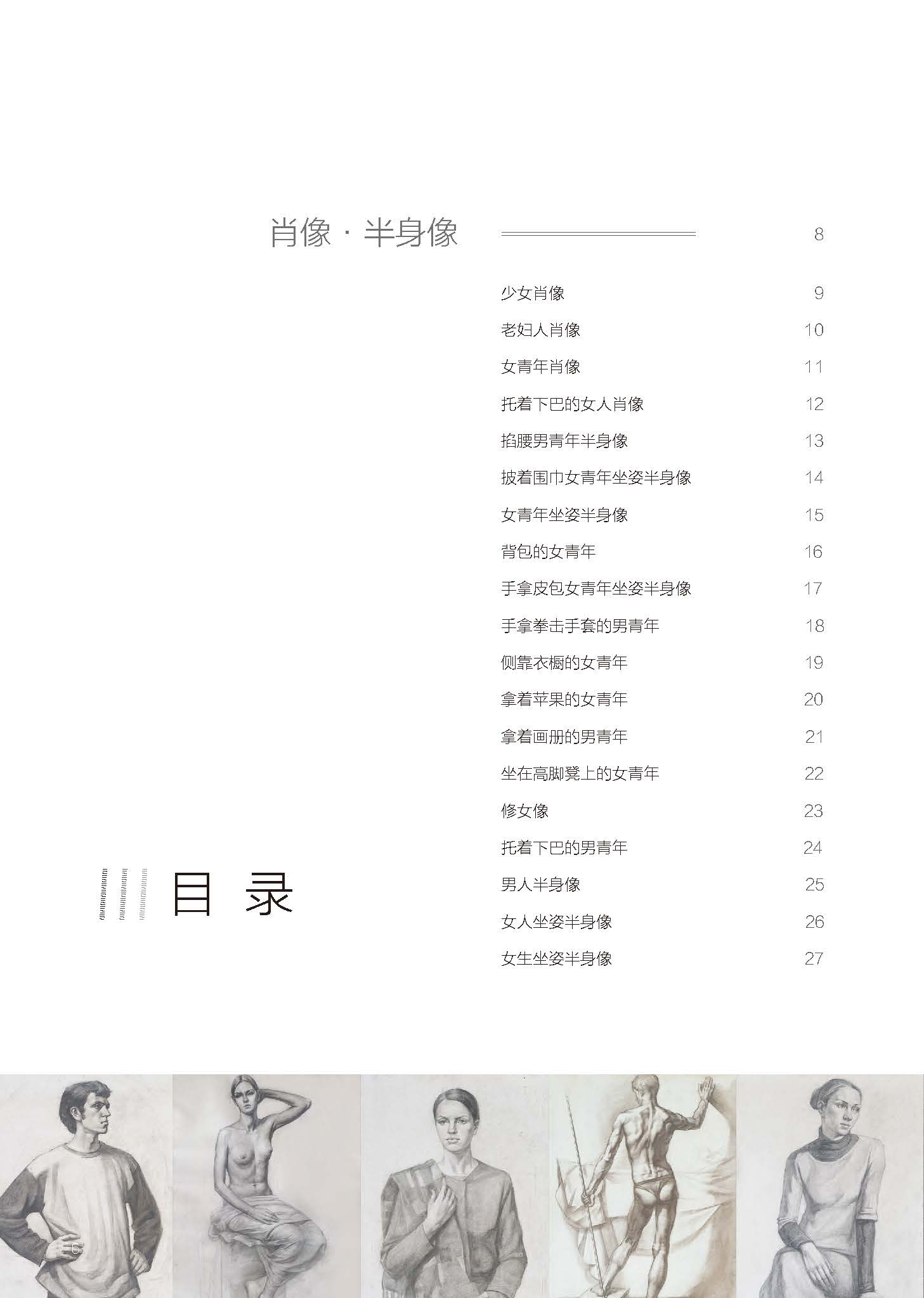 有人说素描是单色画,也有人说素描是朴素的描绘.但是菲利普•罗森说:“素描是简色痕迹的艺术。”可是,简色素描并非单色素描,这个观点可以在众多绘画大师的素描作品当中得到验证,因此我们要摆脱对素描是单色的误读。在列宾美院基础部素描教学体系中,多以短期素描为主要教学手段。短期素描虽然会缺失一些画面中精益求精的细节,但是可以训练学生快速发现画面问题的观察和纠错能力,更有助于学生敏锐地捕捉人物结构特点、动作肢体透视特点和空间虚实特点,为长期素描训练打下坚实基础。《简色——素描印记》一书是一本彩色印刷的,素描作品欣赏书籍。本作品集大概38-40幅素描绘画作品。所涵盖作品主要风格是传统绘画写实风格,强调的是人体解剖结构,人体比例和人体力量美学,展现扎实的人物题材绘画写实能力。