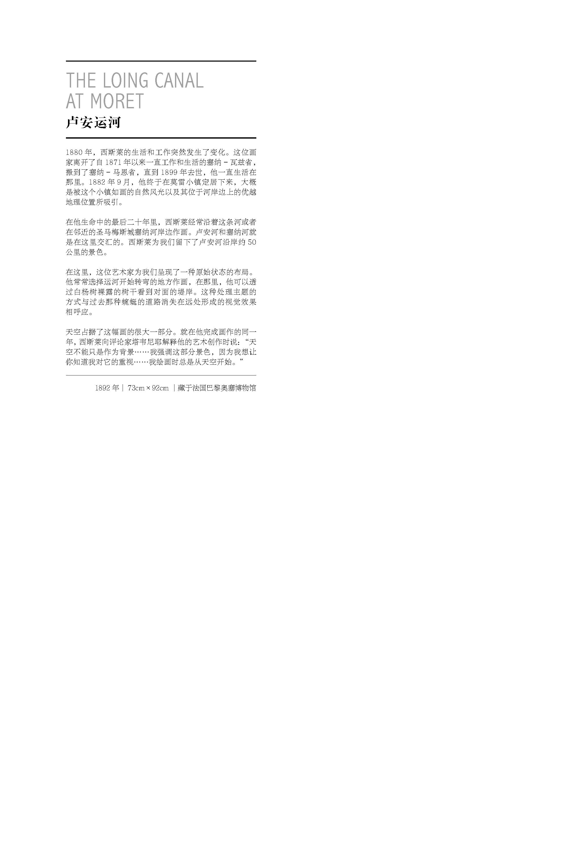 本系列画帖以西方大师经典画作为内容,主要以临摹、赏饰为主,按艺术家分册。每册32张精选大师代表作。深入考虑国内读者需求和审美习惯,规避不良题材和消极内容,每册作品精挑细选。每张作品辅以作者及作品扼要讲解、说明,并附原作规格尺寸,使读者能够更加深入地了解作者及原作,帮助读者更准确地理解作品,从而做到在理解的前提下欣赏,和更有目的地临摹学习。本册为阿尔弗莱德•西斯莱作品,一本包括西斯莱32幅珍贵画作,《马尔利港的洪水》《路维希安的雪景》《在溪边休憩》……活页散装、方便临习,高清印刷、原作比例,是教学对话,装饰的不二之选。