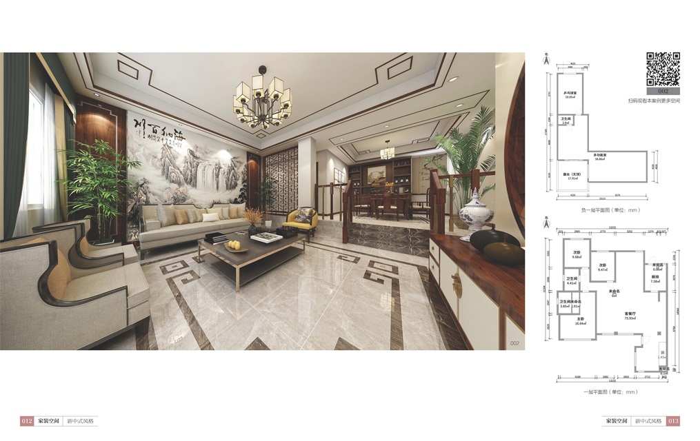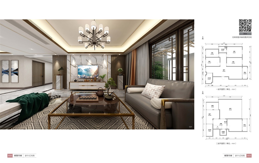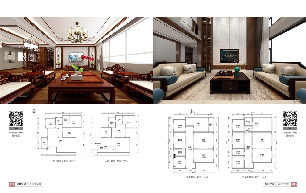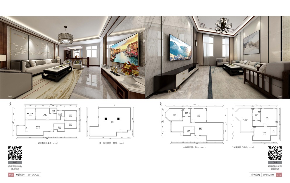 本书除复式户型外,每套效果图都配有两个二维码,扫描二维码可以看到整套案例(复式户型只有一个二维码)。扫描左侧或上方二维码,效果图出现后,点击右栏的“工具”栏,便可使用其中的多个工具选项,尤其是“尺寸线”,可以让您更清晰地看到户型中各个空间和家具的尺寸,非常具有参考性。扫描右侧或下方二维码,呈现的是自动播放的效果。