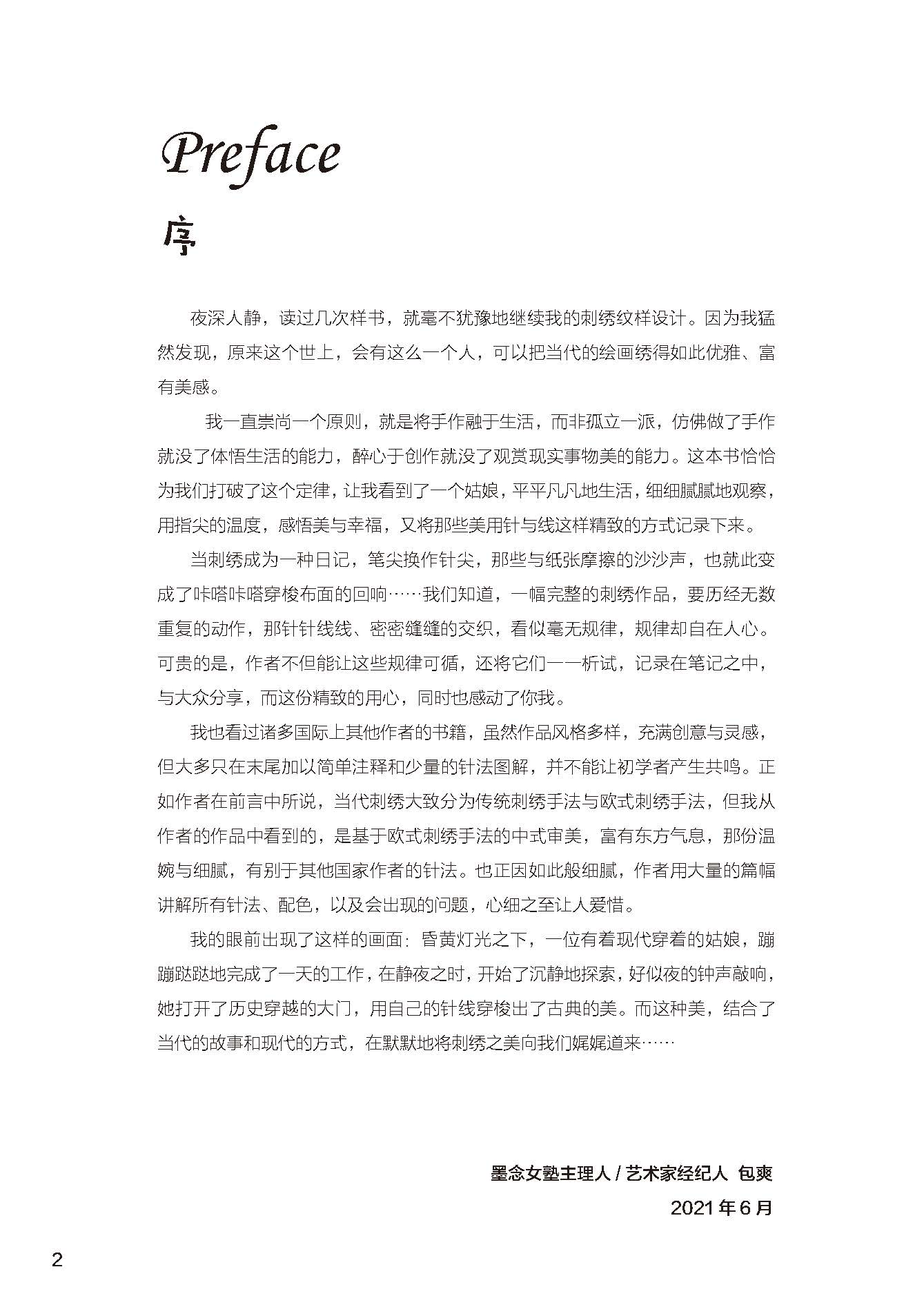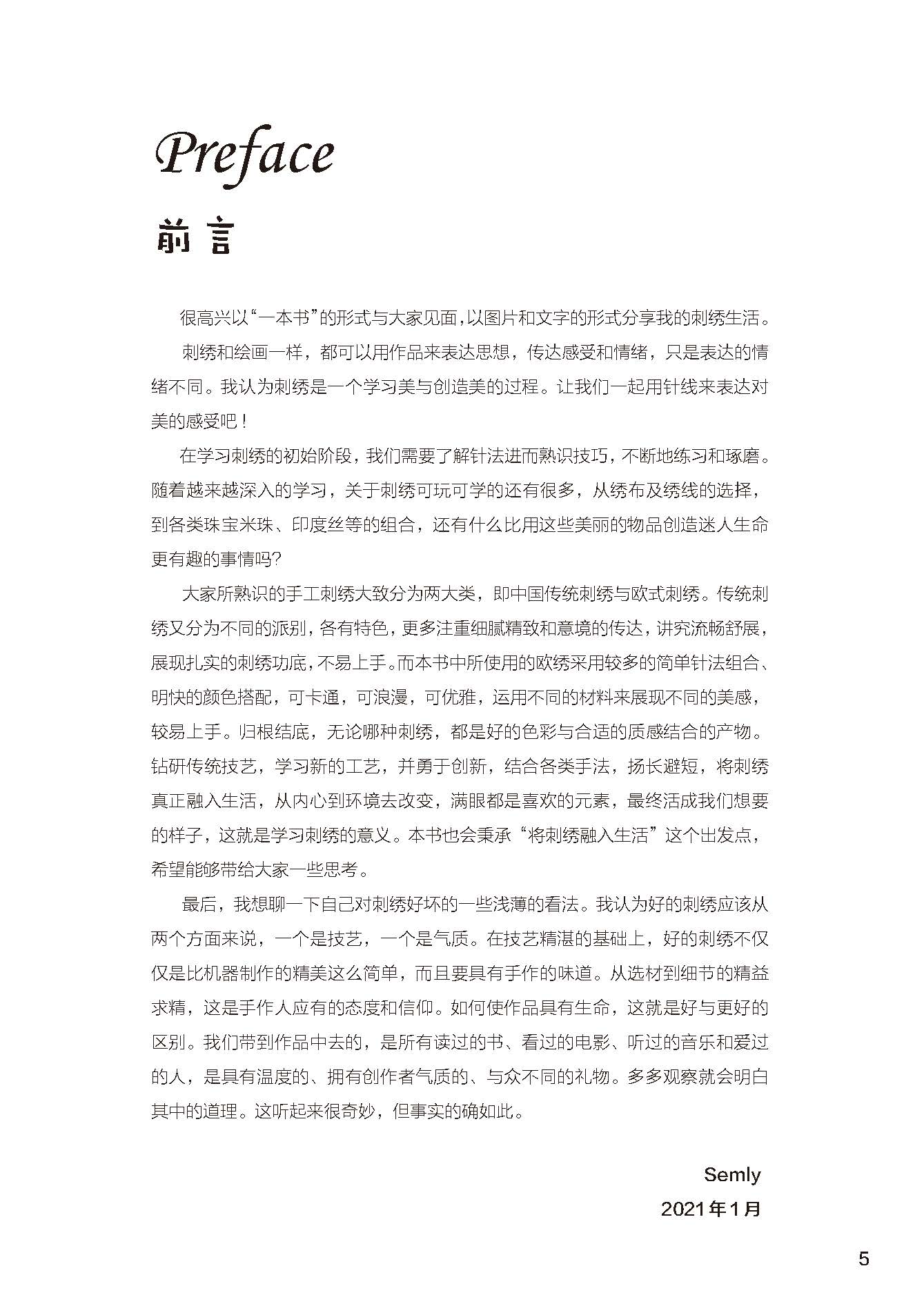本书中所使用的欧绣采用较多的简单针法组合、明快的颜色搭配,可卡通,可浪漫,可优雅,运用不同的材料来展现不同的美感,较易上手。归根结底,无论哪种刺绣,都是好的色彩与合适的质感结合的产物。钻研传统技艺,学习新的工艺,并勇于创新,结合各类手法,扬长避短,将刺绣真正融入生活,从内心到环境去改变,满眼都是喜欢的元素,最终活成我们想要的样子,这就是学习刺绣的意义。本书也会秉承“将刺绣融入生活”这个出发点,希望能够带给大家一些思考。